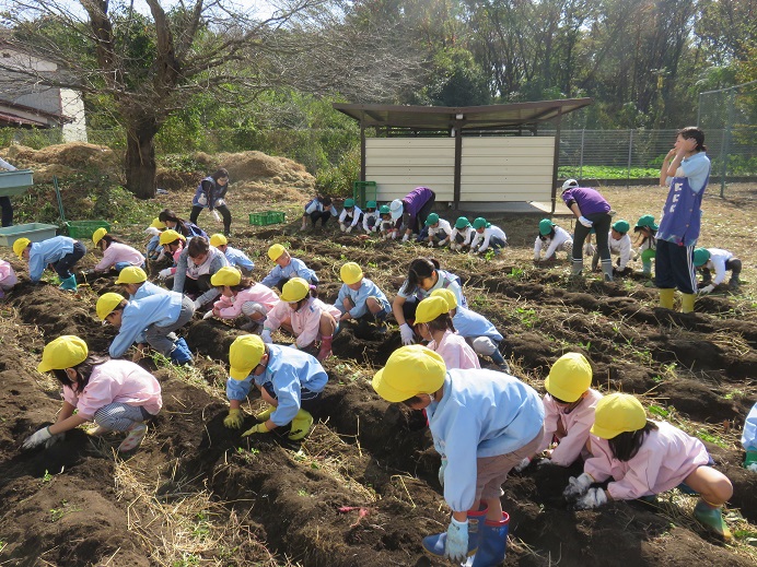 今日は、大成学園幼稚園と額田保育園の子どもたちが一緒にさつまいも掘りをしました。