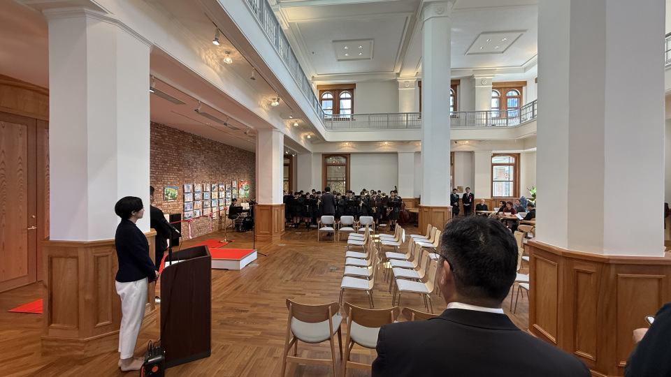 本日の開館式典では、本学園の大成女子高等学校吹奏楽部がファンファーレおよび式典開始前演奏させていただきました。