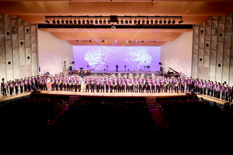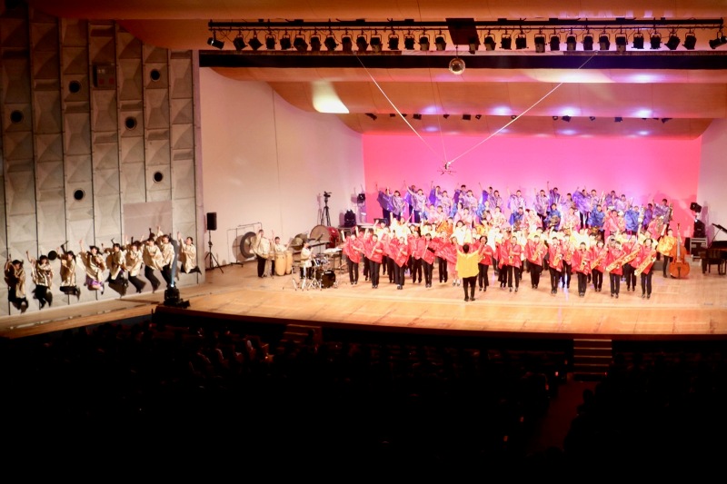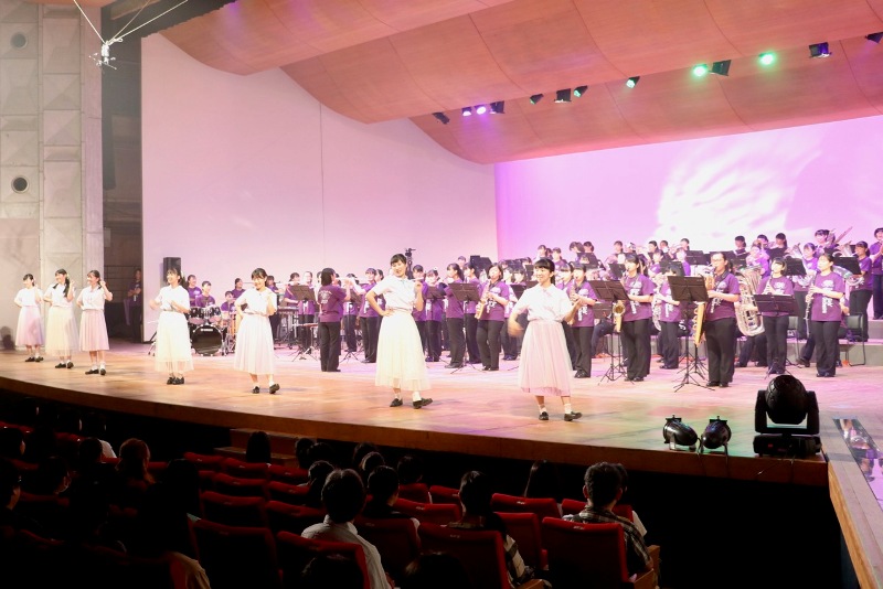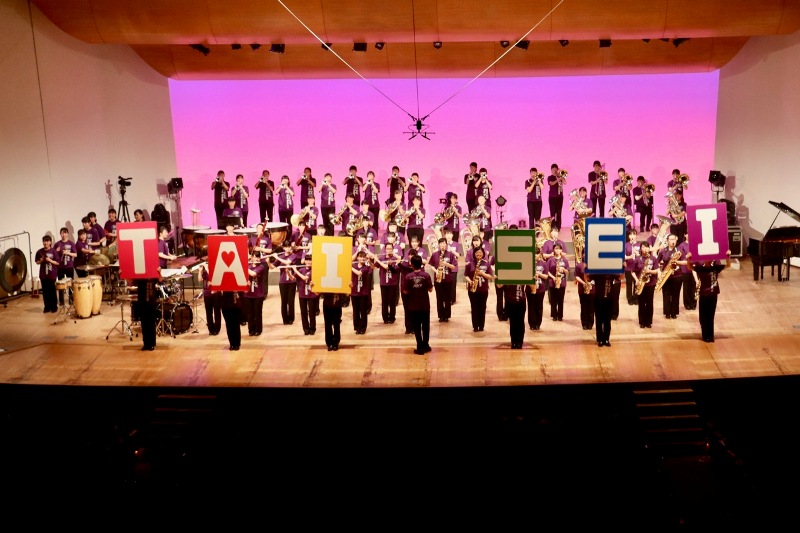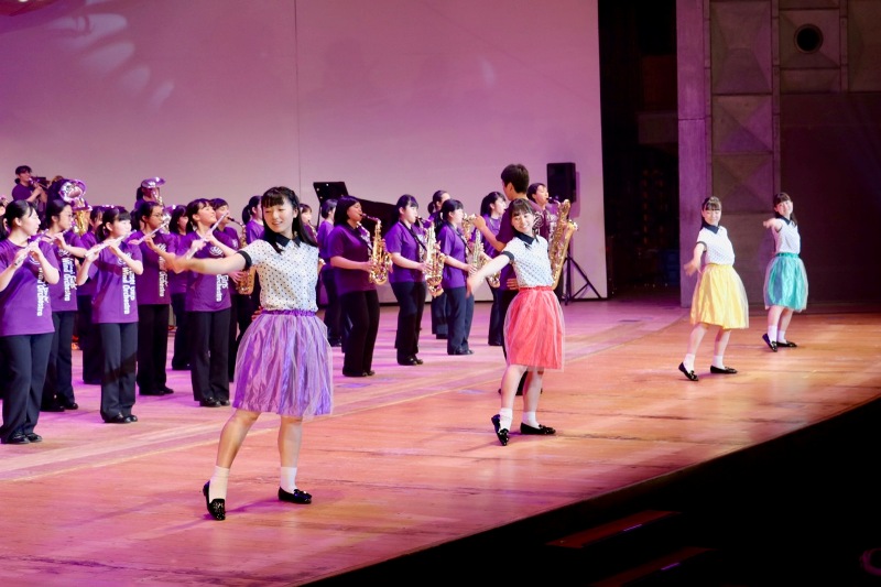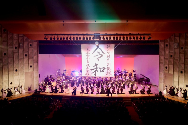 昭和・平成・令和メドレーでは、それぞれの時代に流行った曲をメドレーとし、最後にはゴールデンボンバーの「令和」を演奏しました。クライマックスでは書道部に書いていただいた大きな令和の字がステージ上に現れ、とても盛り上がることができました。