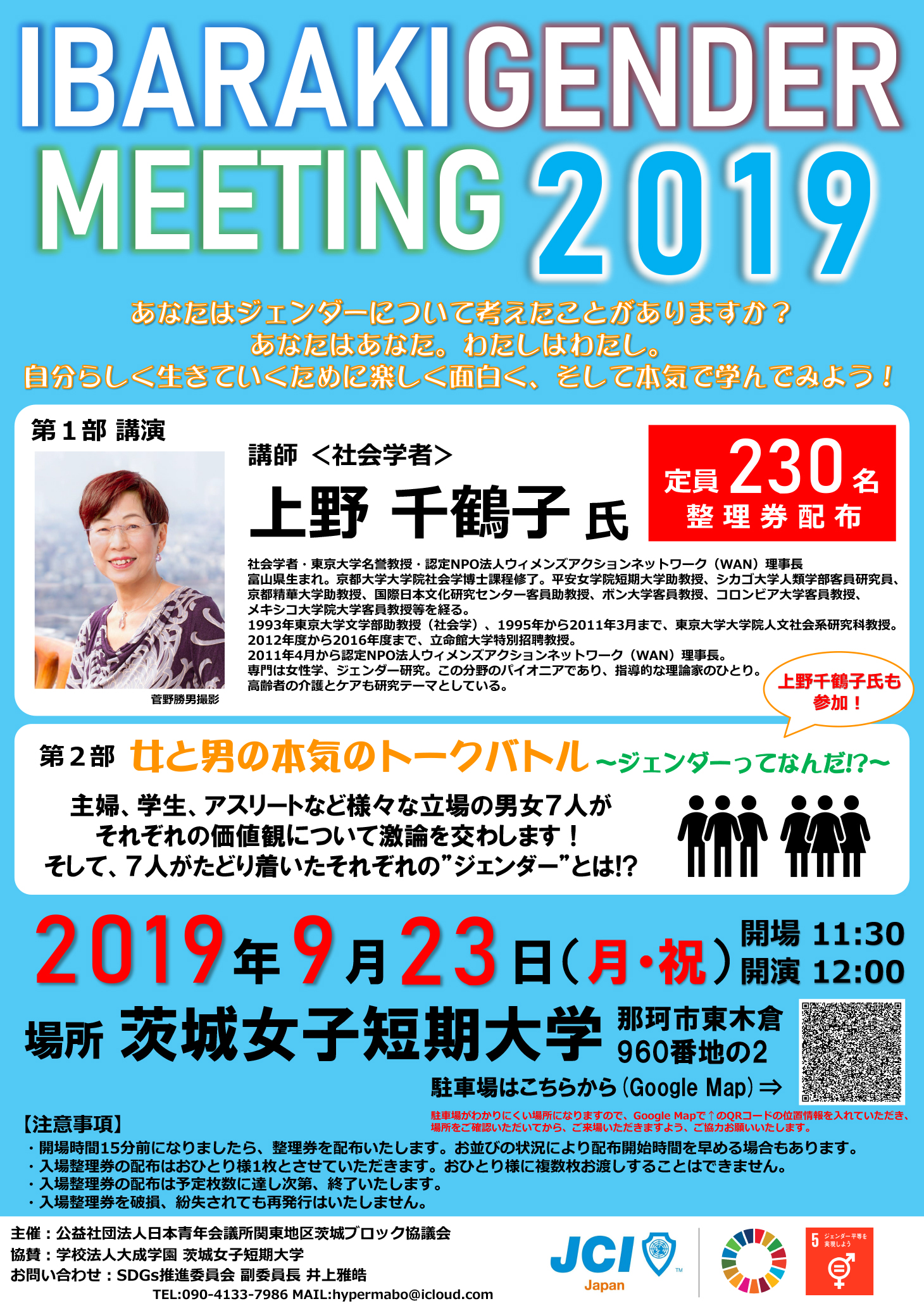 上野千鶴子先生講演会 2019 9/20 ニュース 社会学者の上野千鶴子先生の講演会が、秋分の日の23日(月)に姉妹校の茨城女子短期大学で開催されます。 主催は公益社団法人日本青年会議所関東地区茨城ブロック協議会です。 ご関心のある方は是非ご来場ください。 ニュース URLをコピーしました! 撫子祭に向けての準備、進行中! 卓球部 全日本選手権ジュニアの部茨城県予選に参加 小林優勝! コメント コメントする コメントをキャンセルコメント ※ 名前 ※ メール ※ サイト 次回のコメントで使用するためブラウザーに自分の名前、メールアドレス、サイトを保存する。 上に表示された文字を入力してください。 Δ