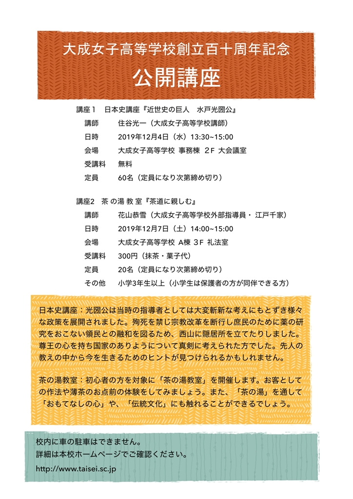 大成女子高等学校創立110周年記念 公開講座のお知らせ 2019 10/08 特色ある教育 公開講座通知 申込方法 特色ある教育 URLをコピーしました! 吹奏楽部 東関東マーチングコンテストで銀賞! 吹奏楽部 マーチングを披露しました! コメント コメントする コメントをキャンセルコメント ※ 名前 ※ メール ※ サイト 次回のコメントで使用するためブラウザーに自分の名前、メールアドレス、サイトを保存する。 上に表示された文字を入力してください。 Δ