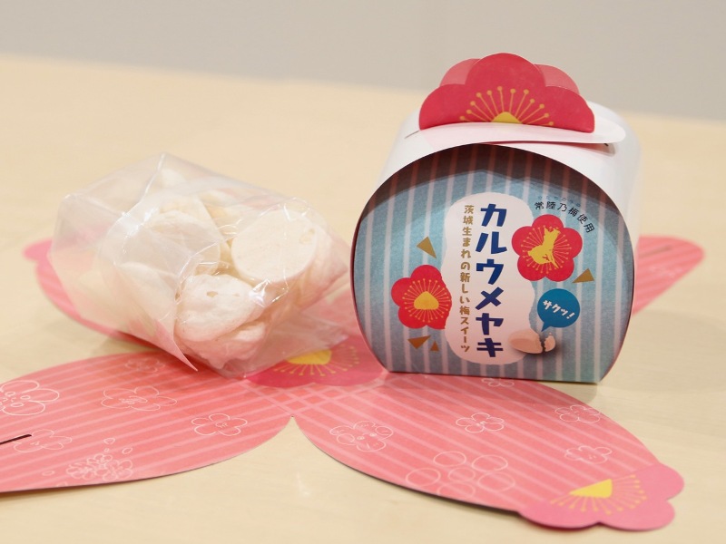 「カルウメヤキ」は、茨城の梅をテーマにしたお菓子で、サクッとした食感が特徴的なメレンゲクッキーです。お菓子のきくちさんと、大洗の吉田屋さんにて販売しております。皆様、是非ご賞味ください!