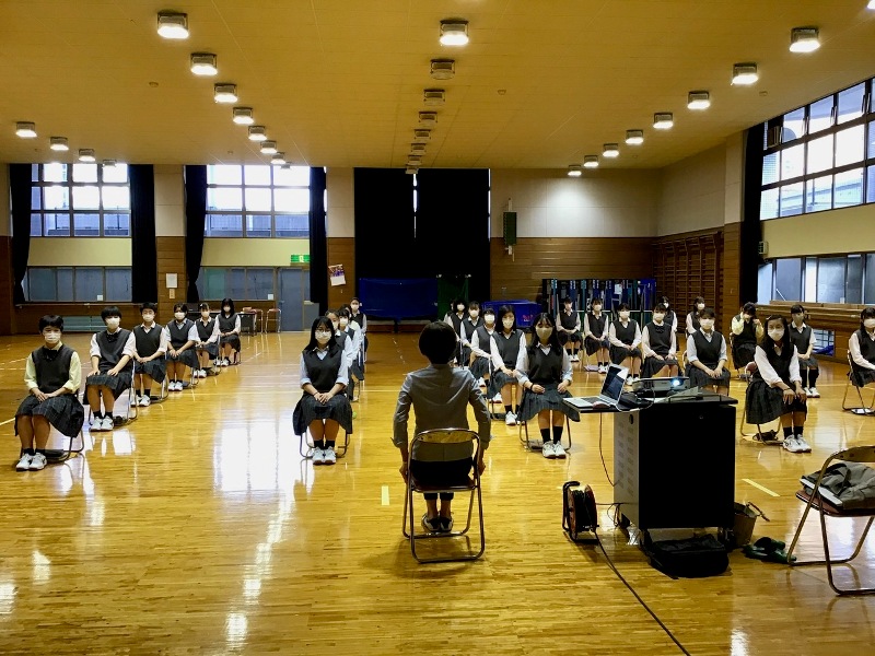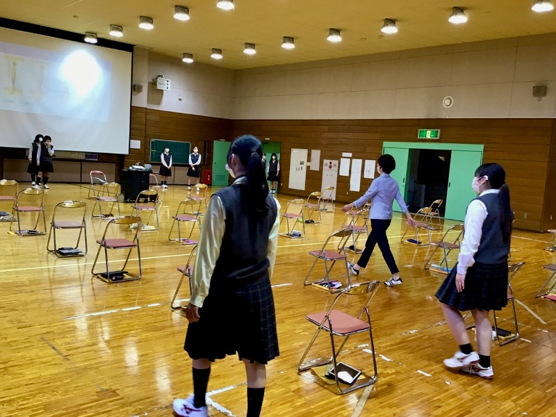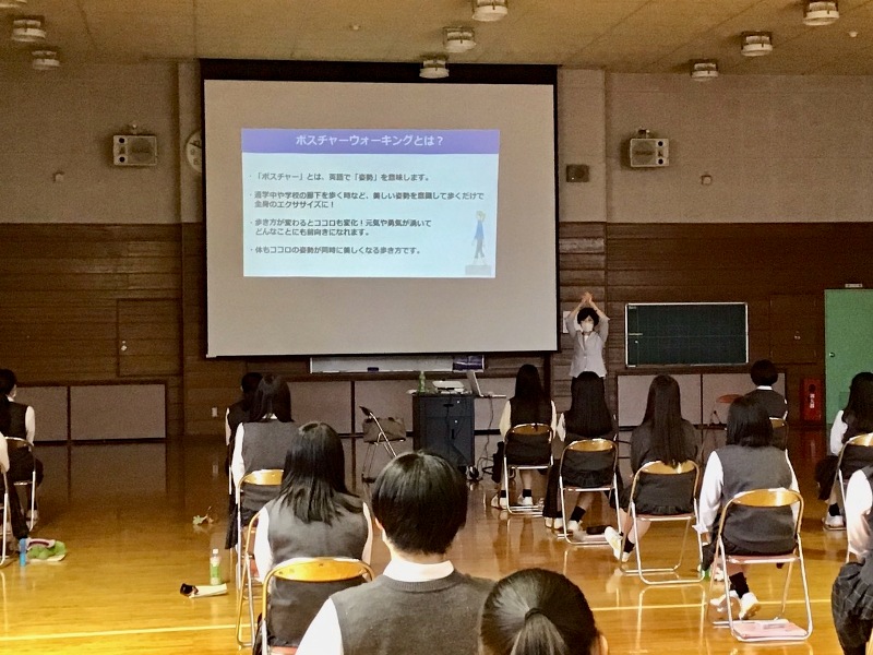 「ポスチャー」とは「姿勢」のことです。講座では、「通学中や学校の廊下を歩く時など、美しい姿勢を意識して歩くだけで全身のエクササイズになる」や「歩き方が変わるとココロも変化し元気や勇気が湧いてくる」「どんなことにも前向きになれる」などの解説のあと、ウォーキングや美しい姿勢を実践しました。参加した生徒は、体とココロの姿勢が同時に美しくなることができとても充実した体験になりました。