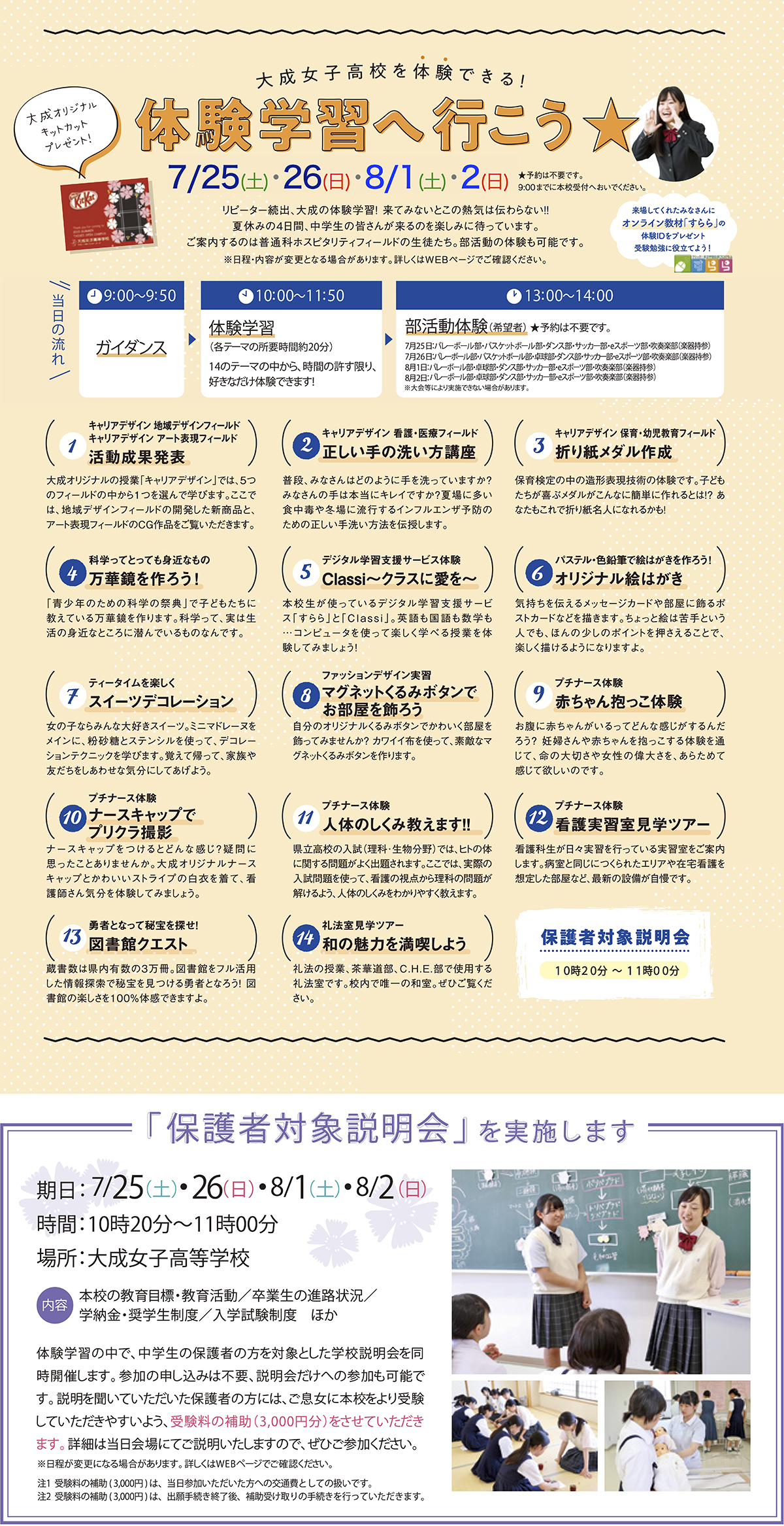 「体験学習・保護者説明会」 7月25日・26日・8月1日・2日に開催します!予約不要!