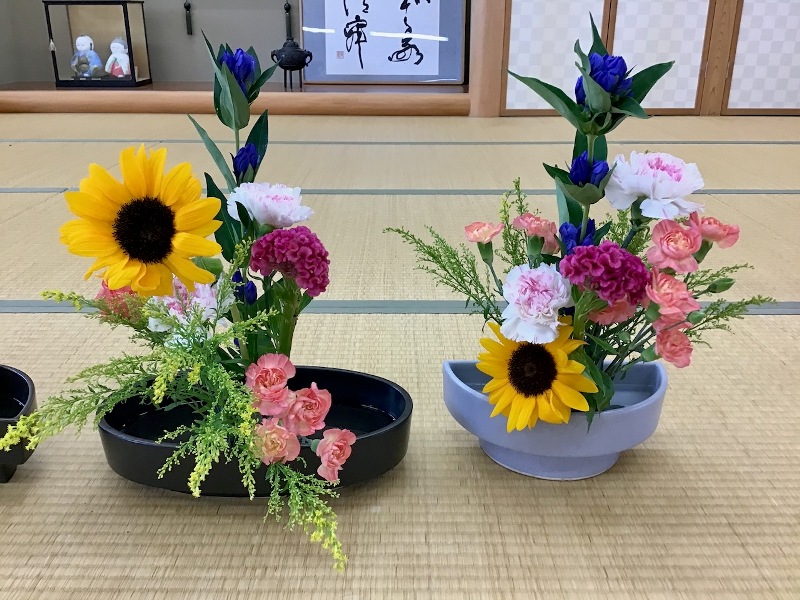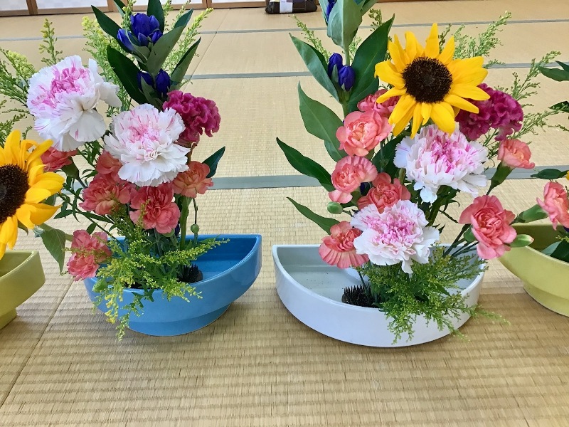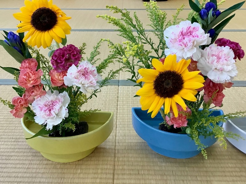 生け方にもコツが必要で難しいですが、とても楽しいです。お花は季節ごとに変わります。今回は、ひまわりを中心に生けました。