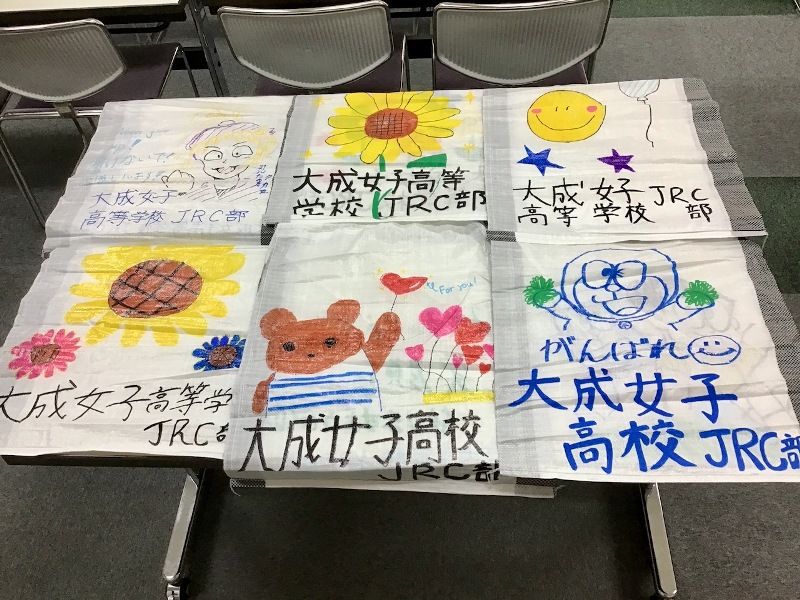 8月27日(木)「被災地に土嚢袋を送る会(那珂市)」代表 佐々木典明さんのご指導により、写真のような土嚢袋が出来上がりました。土嚢袋に描かれたメッセージが人々を力付けるというお話を伺い、初めての取り組みでしたが、部員みな、気持ちを込めて作成することができました!
