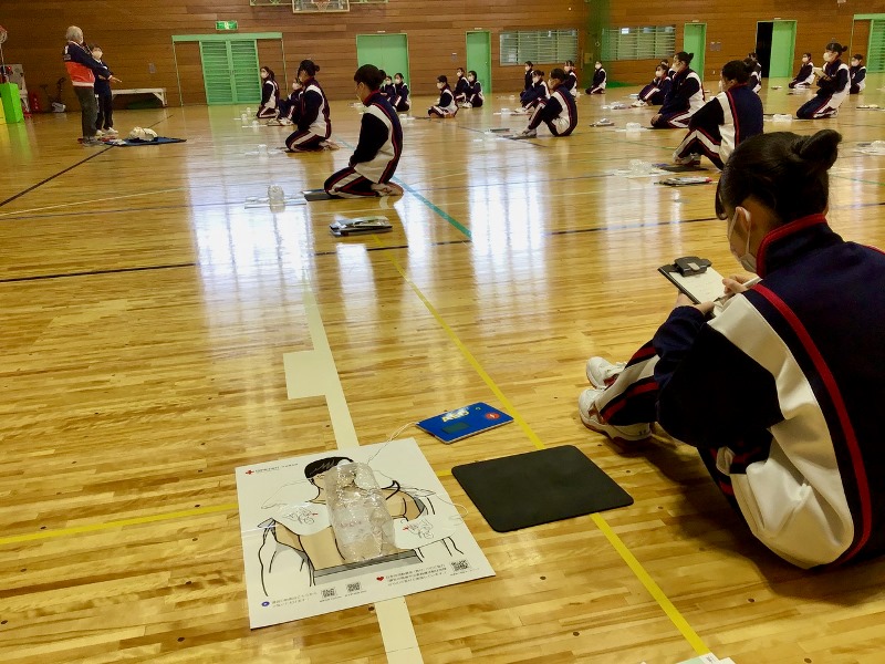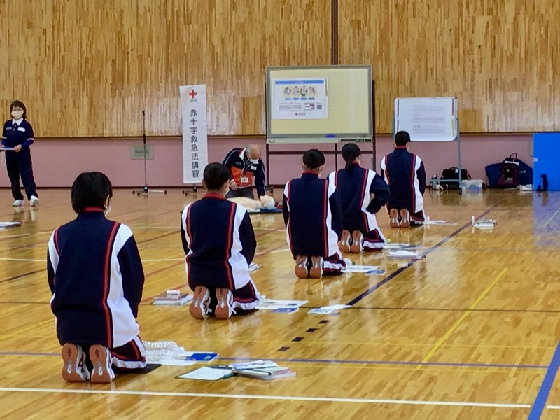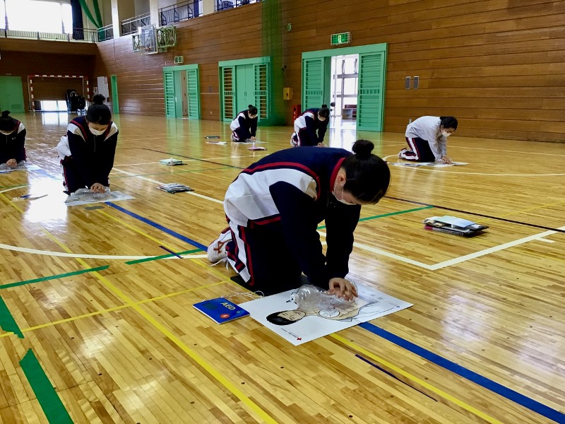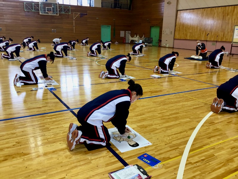 3月9日、看護科2年生が日本赤十字茨城支部より救急法の指導員の先生をお招きして、救急法の短期講習を行いました。感染対策を行いながら、心肺蘇生とA E Dの使用方法を学び、傷病者を発見した時の声かけの仕方や、胸骨圧迫の方法などを体験しました。
