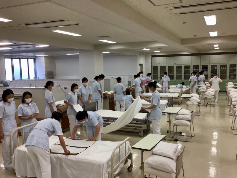 「色々な不安はありましたが、始まるとあっという間でした。1つの作業に集中すると患者さんに背を向けてしまいそうになったりして常に色々なことへの配慮が必要なんだと改めて思いました。しわを作らないよう心がけていたのですが、やはり難しかったです。ですが、二度目は一度目より上手にできて嬉しかったです。二度目ではボディメカニクスなども少し意識することができました。祖母の家などでできる機会があれば練習を重ねたいなと考えています。初実習疲れもしましたが楽しかったです!」