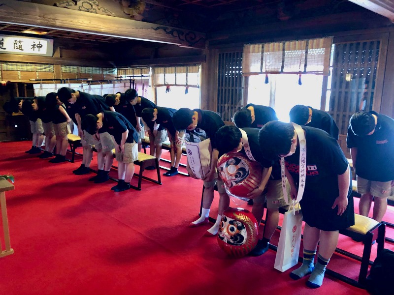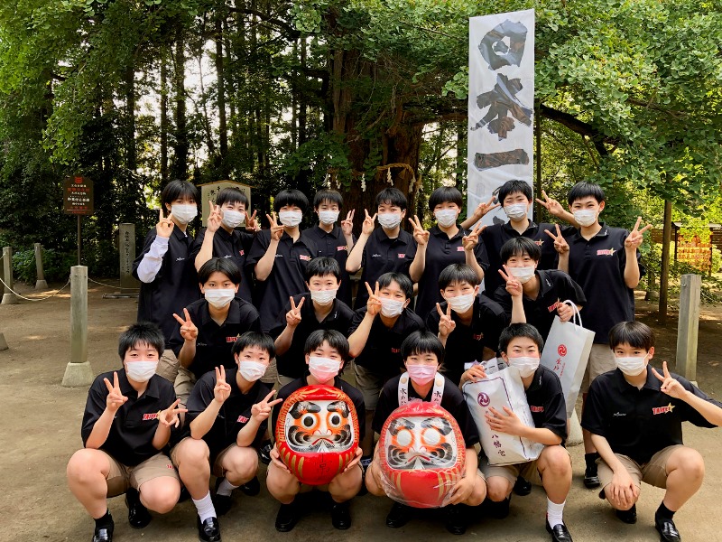5月25日(火)は大安で天気も良かったので、今までお世話になっただるまを焚き上げに水戸八幡宮へ行きました。部員全員で必勝祈願をしてもらい、新しいだるまを購入しました。「何だかこのだるまさん大きいぞ!!!」