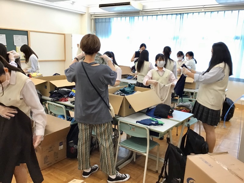 6月21日から7月12日まで、校内において衣料品回収キャンペーンを行い、たくさんの衣料品が集まりました。7月14日にアダストリアの方にご来校いただき衣料品の分別、梱包作業を一緒に行いました。