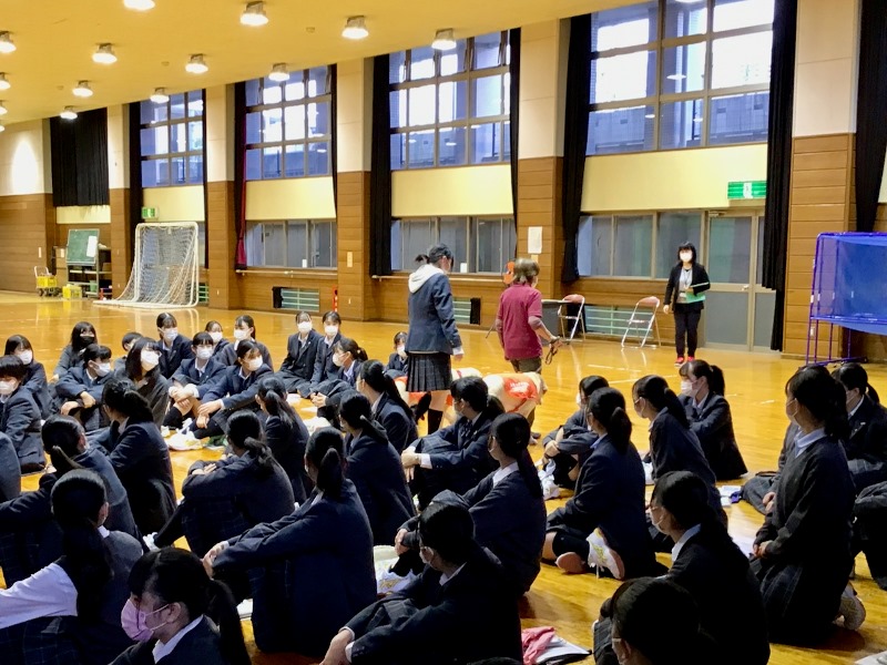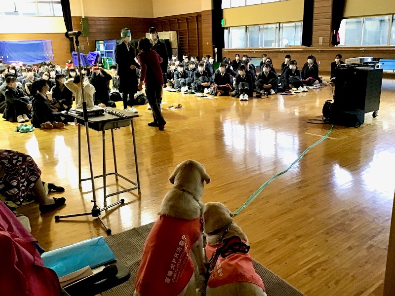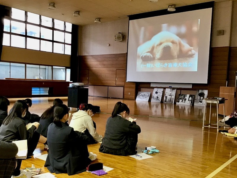 10月19日(火)、家政科と看護科の1年生はキャリアデザインAで盲導犬について学びました。実際の盲導犬を前に、目を輝かせながら真剣に講義を聞いていました。