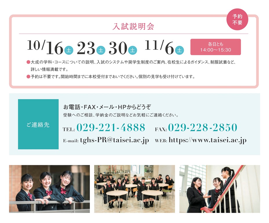 当日は、入試に向けてのアドバイスや在校生による入試体験談など、参加しないと聞けない情報が満載。大成の制服試着会もあります。