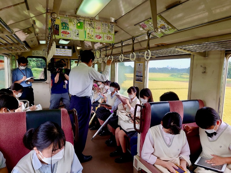 私たちのために専用車両を用意くださり、車内から見える素敵な風景を見ながら、社長さんにゆっくりお話を伺うことができました。NHKの取材の方も同行くださり、初めてのフィールドワークにちょっと緊張しましたが、いろいろな発見があって、とても楽しかったです。これから私たちなりの視点でアイデアを考えて、ひたちなか海浜鉄道さんに提案できるよう頑張ります!
