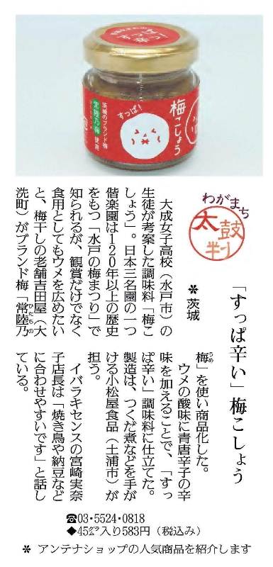 茨城の味としてすっかり定着した梅こしょう。県内では、水戸駅「おみやげや プラム水戸」、土浦市の小松屋食品さま(店頭・オンライン)でお買い求めいただけます。ぜひお試しください!