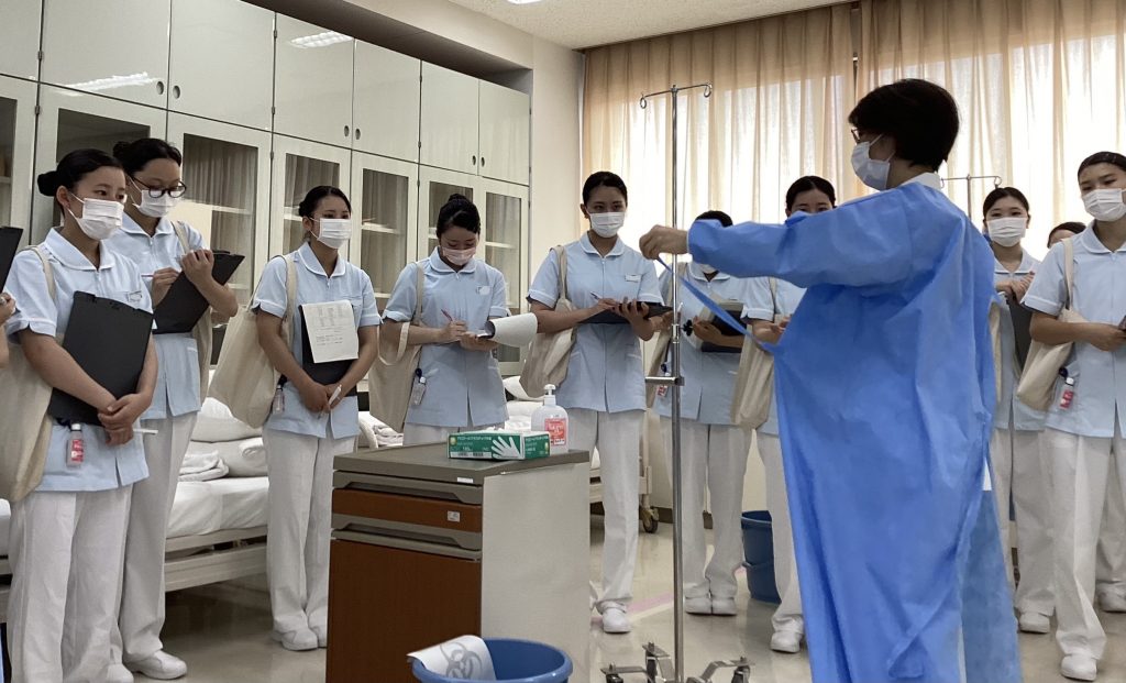 「ガウンテクニック」ではゾーンニングを行った環境で、ディスポーザブルエプロンを衛生的に装着する方法や、感染病室へ入る際のガウンの装着方法を体験しました。