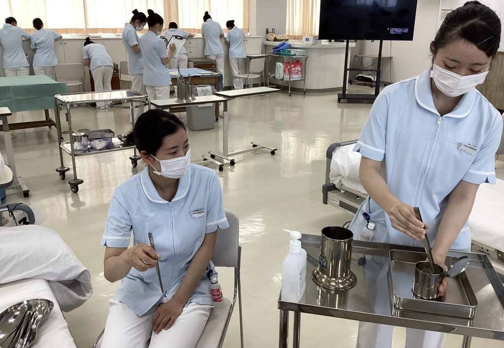 7月13日(木) 感染予防の実技演習を「無菌操作」「ガウンテクニック」「滅菌手袋の取り扱い」の3つの内容にわかれ、C棟総合実習室で行いました。