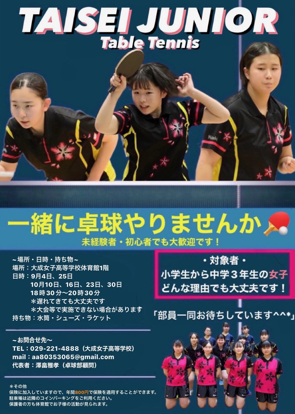★卓球部 大成ジュニア卓球部 参加者募集! 2023 8/30 卓球部 9月、10月の予定を掲載します。小学生から中学3年生が対象です。一緒に汗を流しましょう!詳しくはこちらをご覧ください。 卓球部 URLをコピーしました! ウエストヒルズの夏祭り2023に出展・出演 吹奏楽部 第55回定期演奏会 コメント コメントする コメントをキャンセルコメント ※ 名前 ※ メール ※ サイト 次回のコメントで使用するためブラウザーに自分の名前、メールアドレス、サイトを保存する。 上に表示された文字を入力してください。 Δ