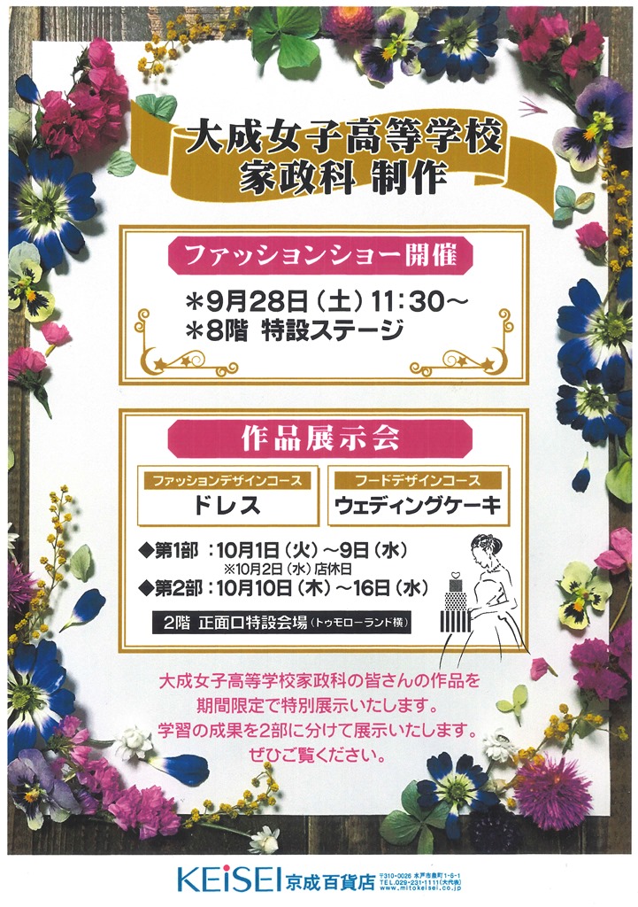 10月1日から16日(2日は店休日)の期間限定で、水戸京成百貨店2階正面口特設会場にて家政科3年生が制作したドレスとウェディングケーキの展示を行います。生徒の学習の成果をぜひご覧ください!