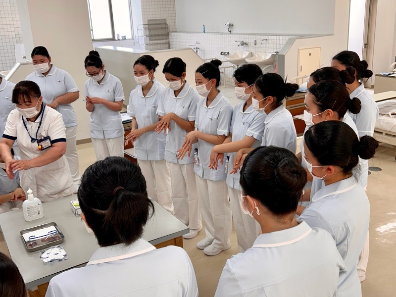 7月3日(木)、看護科1年生はやっと届いた実習用ユニフォームを初めて着用し、看護実習を行いました。真新しいユニフォームに身を包み、感染予防の「手指衛生・個人防護具」患者様の病床環境を整える「ベッドメーキング」に取り組みました。