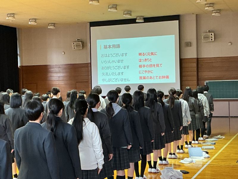 インターンシップに向かう心構えや報連相の大切さについての説明を受けたり、挨拶や礼の仕方について実践練習を行いました。