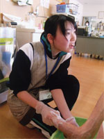 「足浴」「立ち上がり訓練」「音楽療法」などを体験しました。デイケアの仕事は、常に気が抜けない仕事であり、体力的にも精神的にもハードだということがわかりました。またその分、利用者の方から感謝の言葉や笑顔をもらったり、回復していく姿を見届けられるといった喜びもあります。これからの私たちの課題は、医療に関する情報を集めること、身近な人と多く関わることでコミュニケーション力を高めること、さまざまな患者様に接するため精神的な忍耐力をつけることだと思いました。