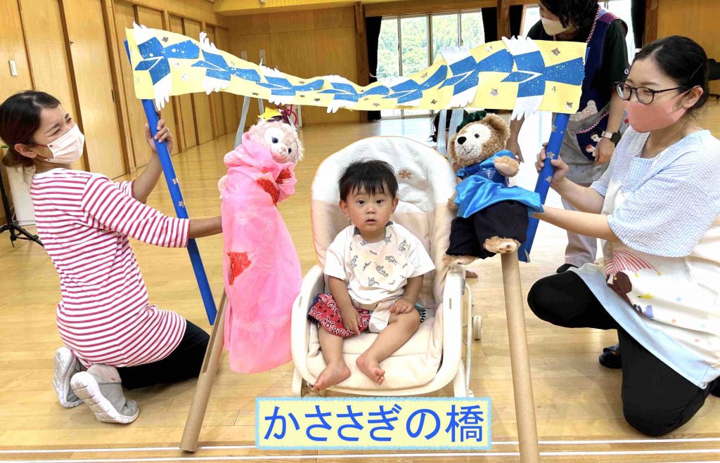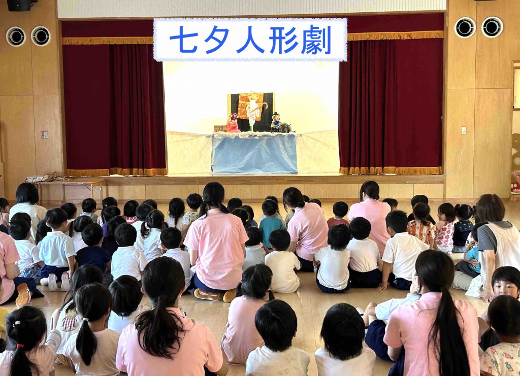 七夕集会では七夕の由来を人形劇で見たり、星空を映像やプラネタリウムで観たりしました。この日は茨城女子短期大学の学生さんが見学実習に来てくれたので子どもたちはとってもうれしそうです💓