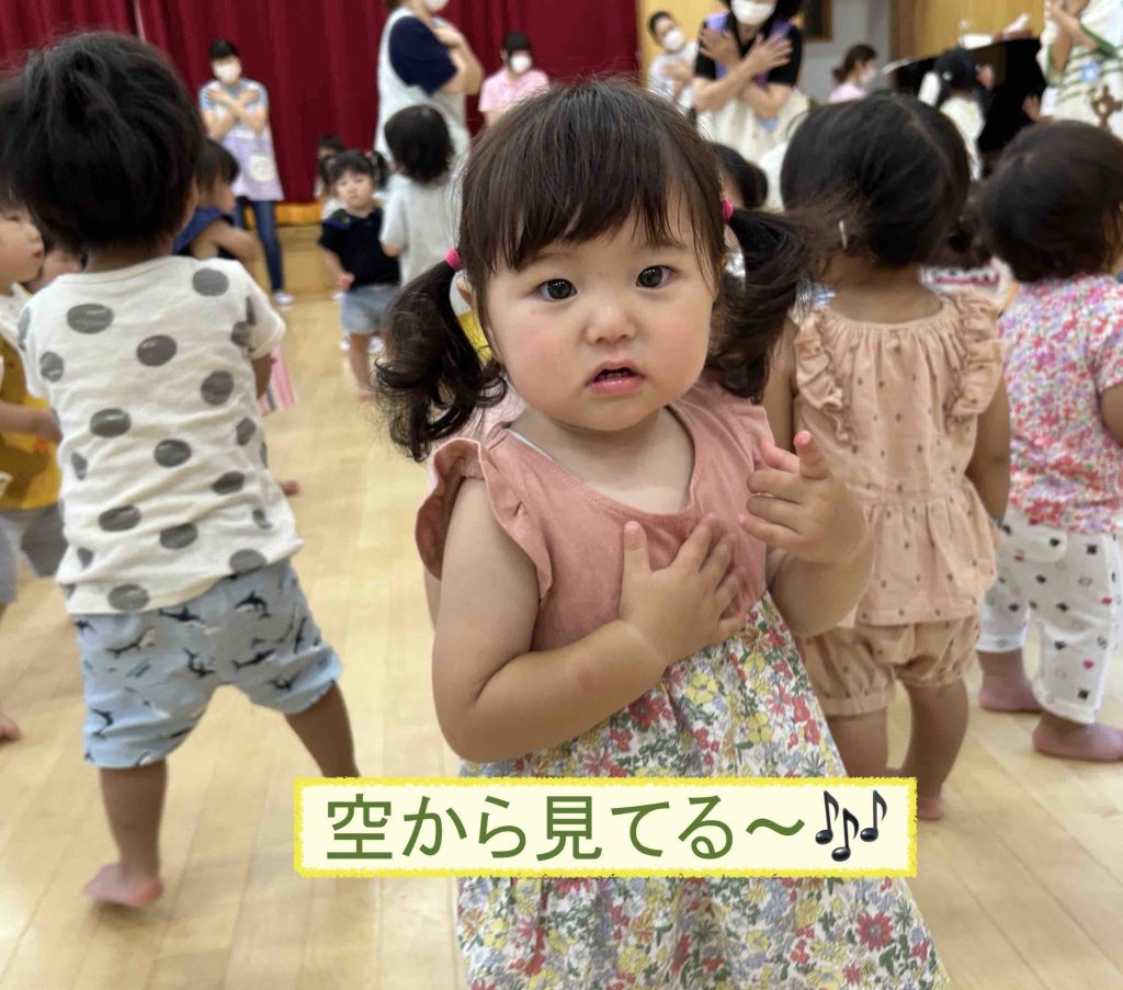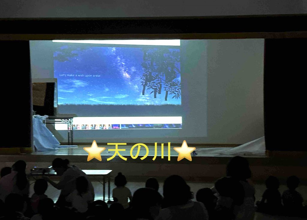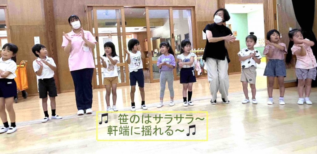 七夕のお歌はみんなでまるくなって歌います🎶園長先生のダンスも素敵です😀織姫と彦星の間のかささぎも橋を渡り、その美しさにうっとりしました♡