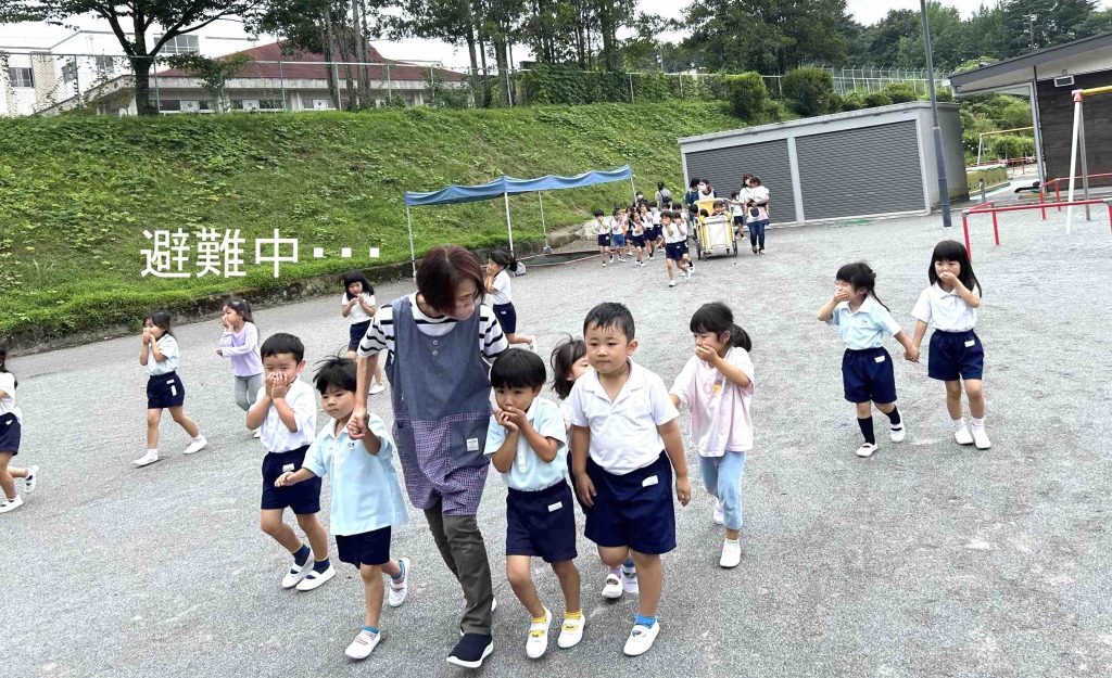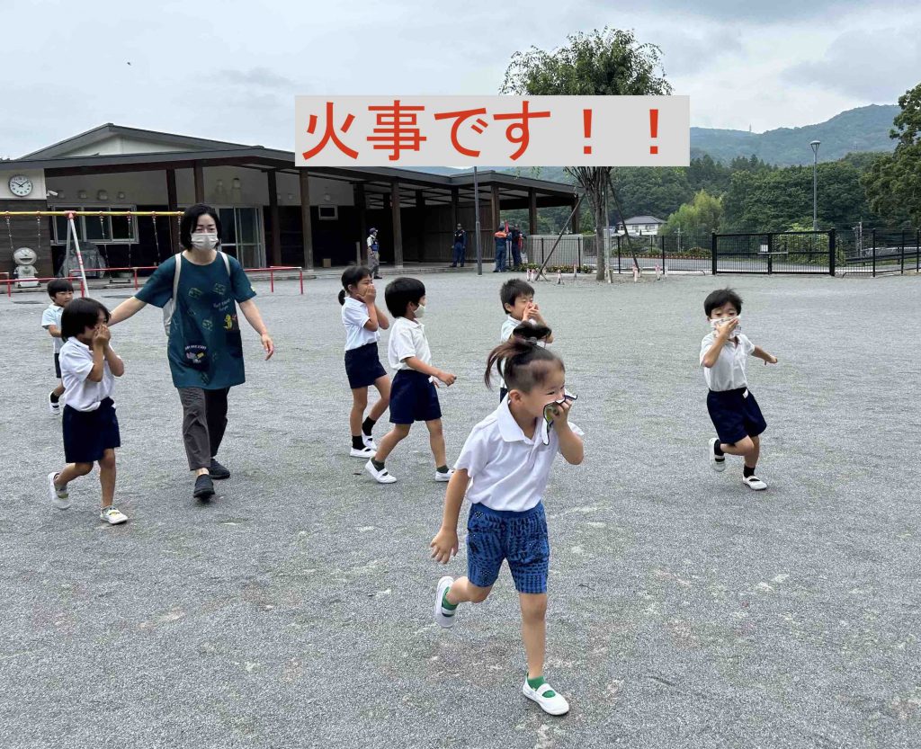 大きいお友達は、火災と聞いて持っていたハンカチで口をおさえています。さすがです✨✨繰り返し訓練をしている成果が見られました。素晴らしいです✨✨