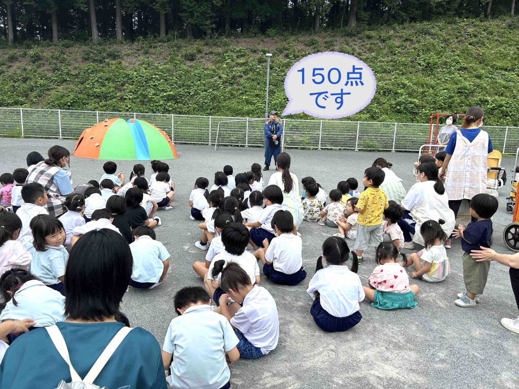 消防士さんから講評をいただきます。『みんな上手に避難できました!!150点です!!』とお褒めの言葉をいただきました(*^▽^*)✨100点超えです!!