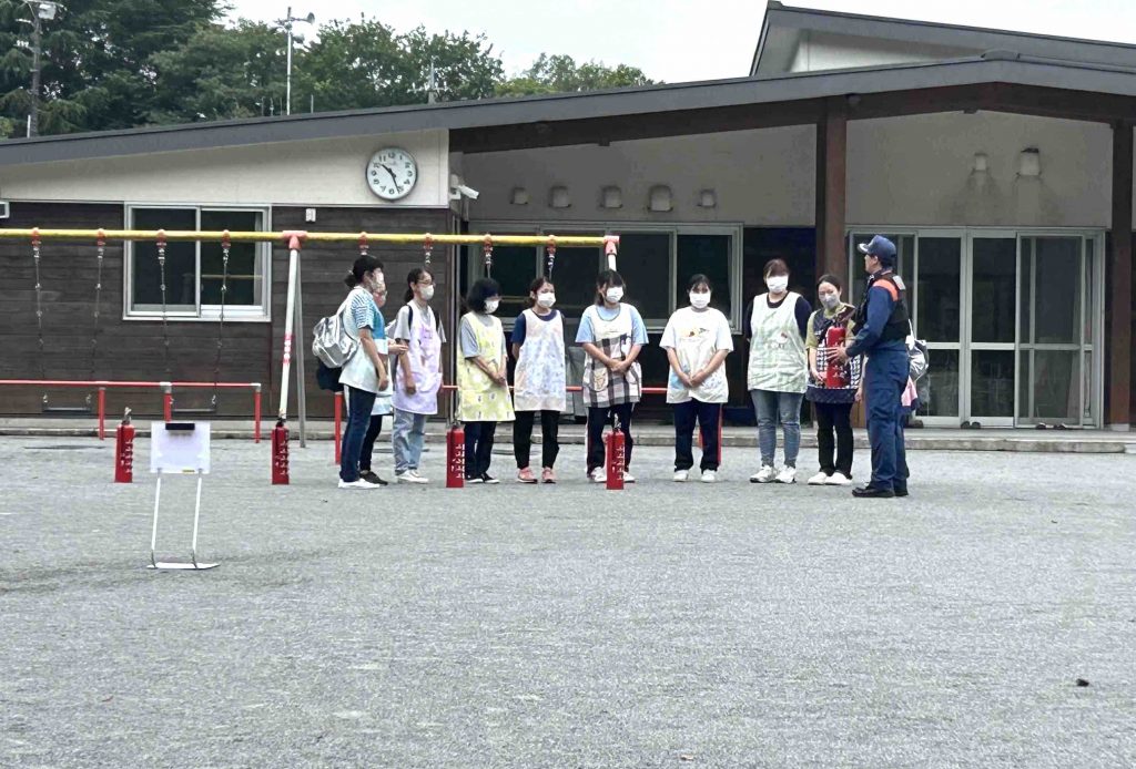 職員による消火器訓練では、消火器の正しい使い方を教えて頂き見事火を消すことが出来ました!!初期消火では、消化器が有効です‼️先生たちはとっても真剣です🤓