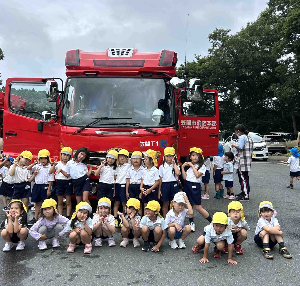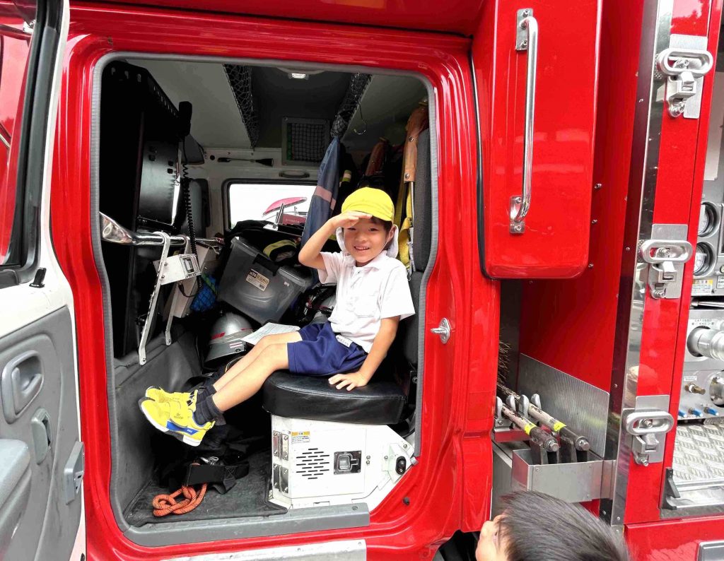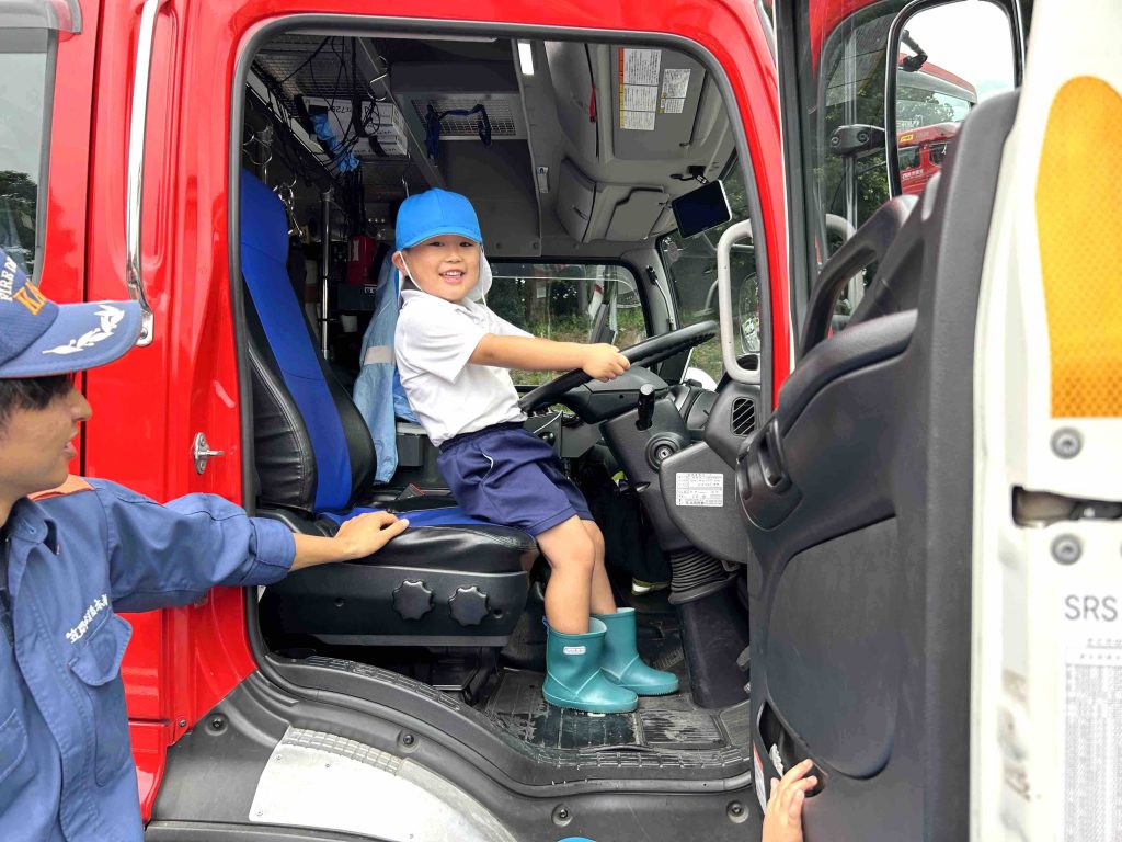 『水はどこに入っているの?』『ホースってどのくらい長いの?』『このレバーはなんですか?』近くで見るからこその疑問がたくさんありました。そばで消防士さんが1つ1つ丁寧に説明してくださり『そうなんだ!!』『すごいね』と感心ばかりする子どもたちでした☺️