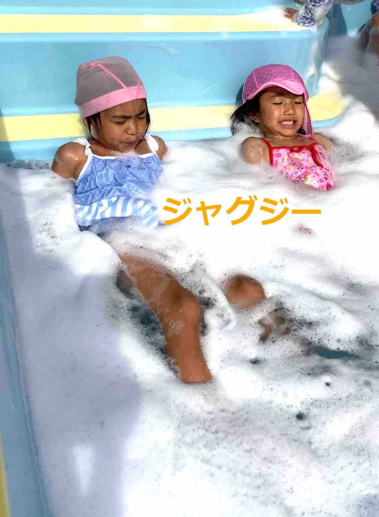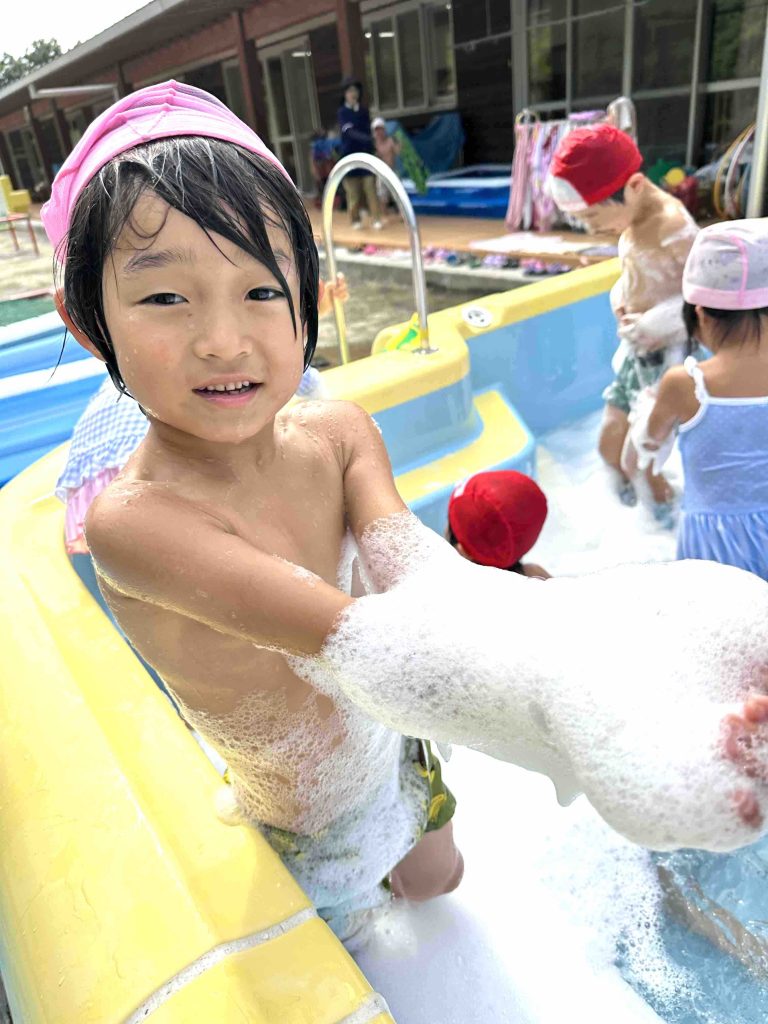 ここで登場するのが泡プール🚿普段のプールがあわあわになっているなんて!子どもたちは目を輝かせます✨