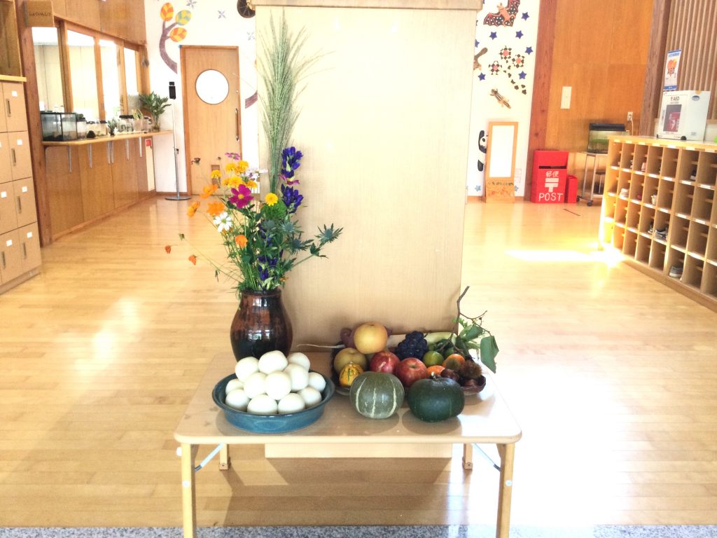 出来たおだんごはお月さまへのお供えです😀ススキや秋の野菜・果物とともに飾ります🍇