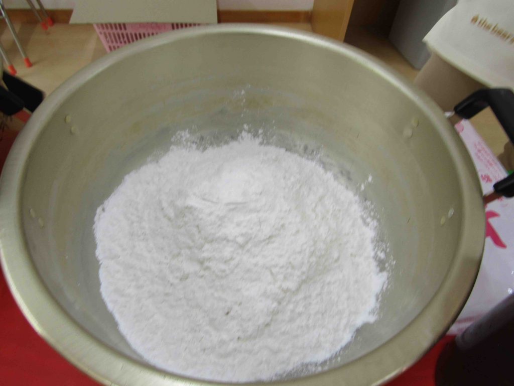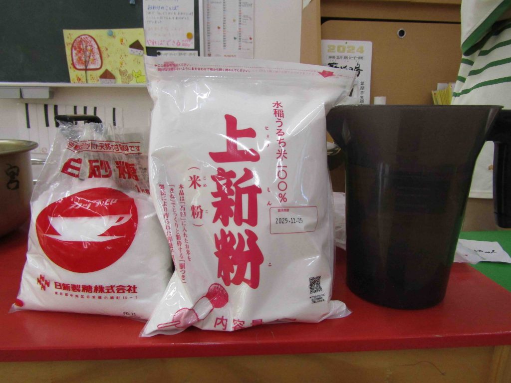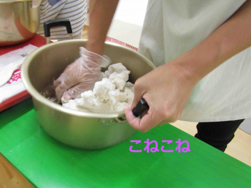 材料は上新粉とお湯、それにお砂糖少々・・・。園長先生がよく混ぜてこねてくれます。