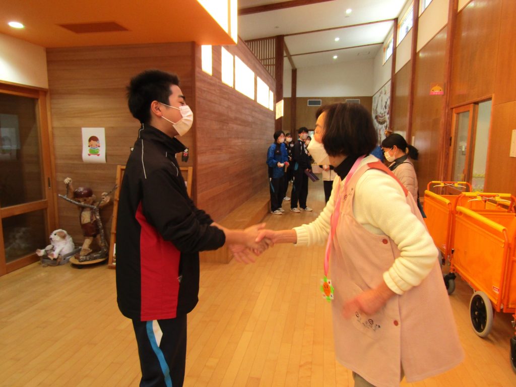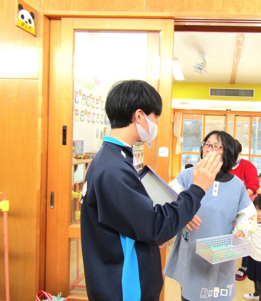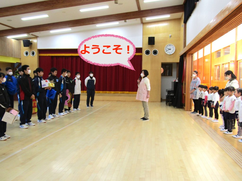 『おはようございまーす』と元気に来園してくれたのは、こども園の近くにある稲田中学校の3年生!