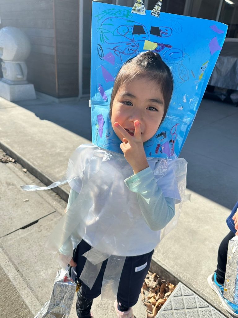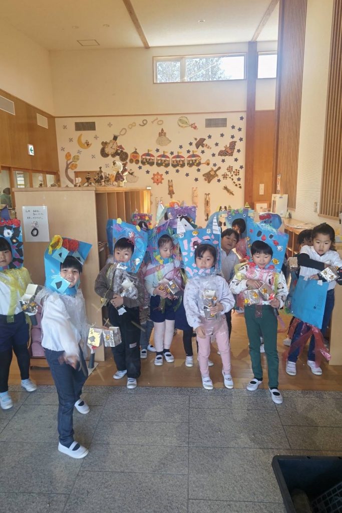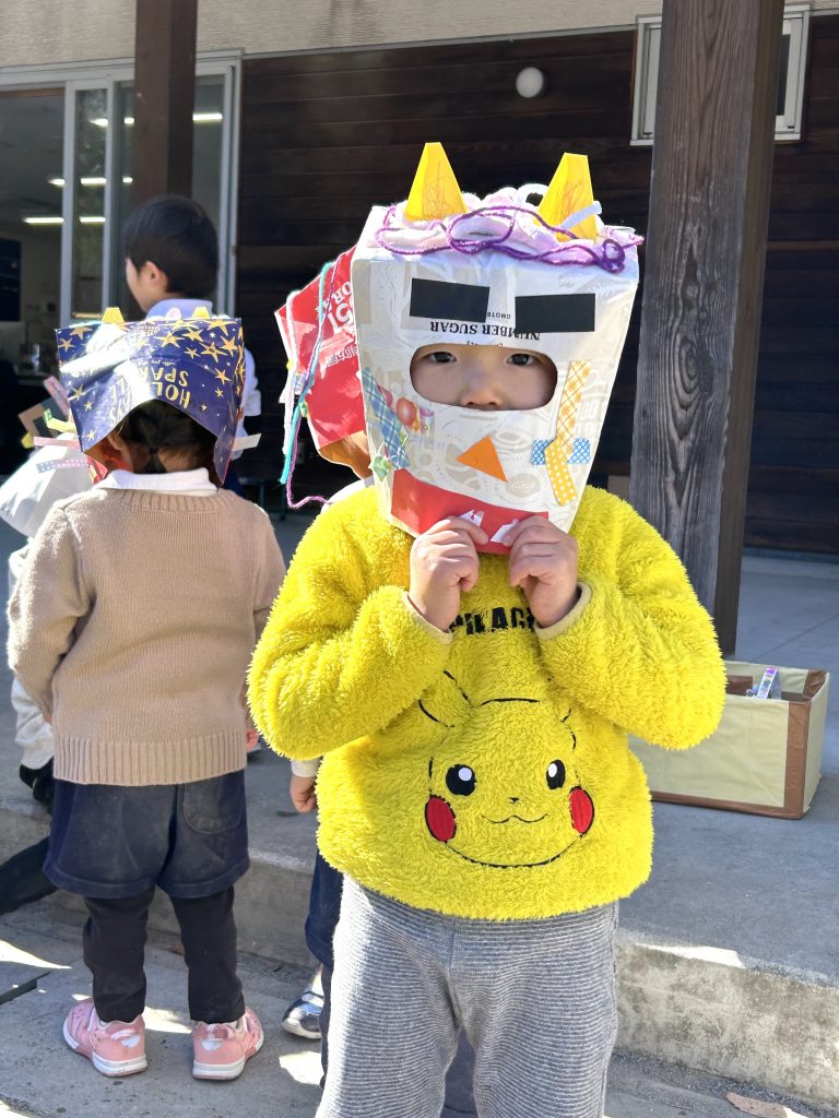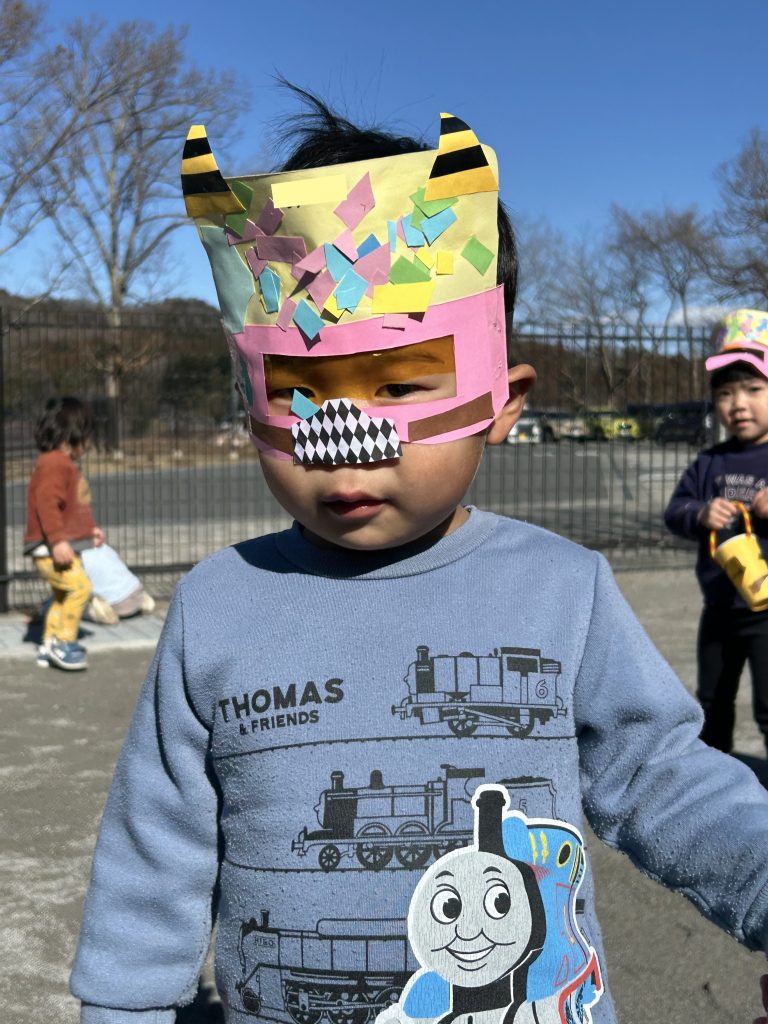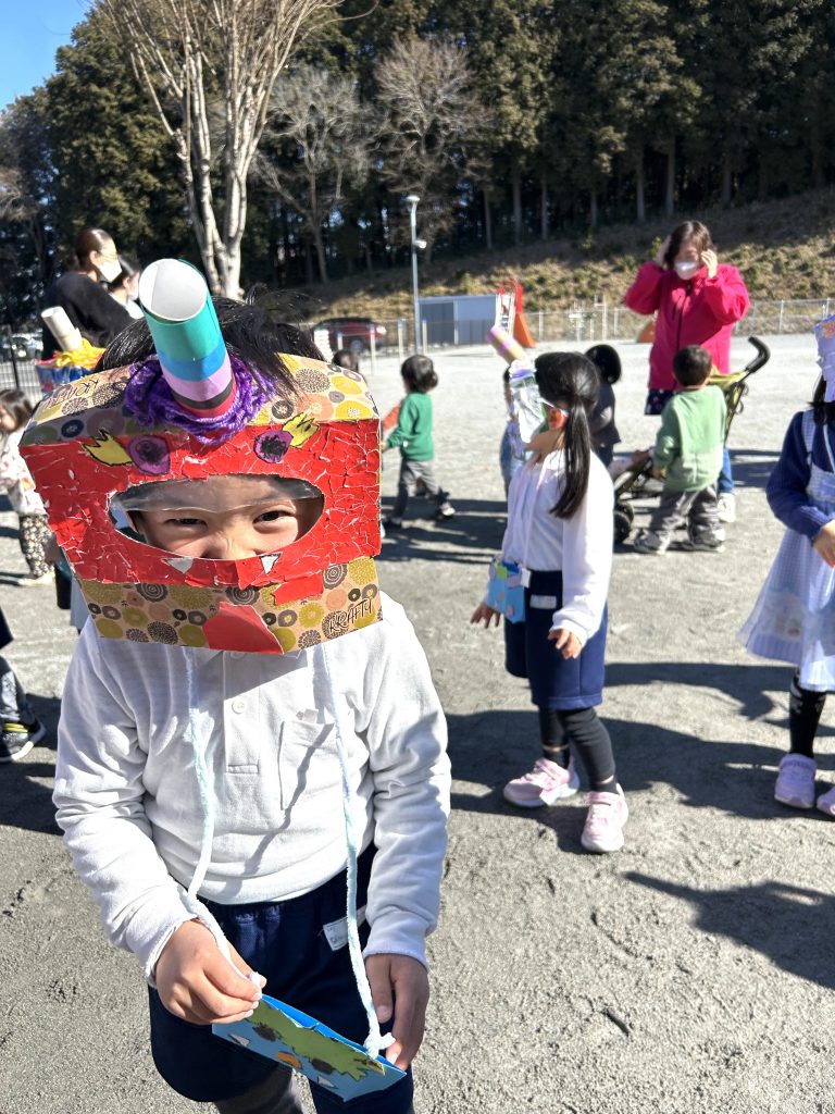 きりん組 1本ツノが立派なお面とポシェットの升 ポーズが決まってる