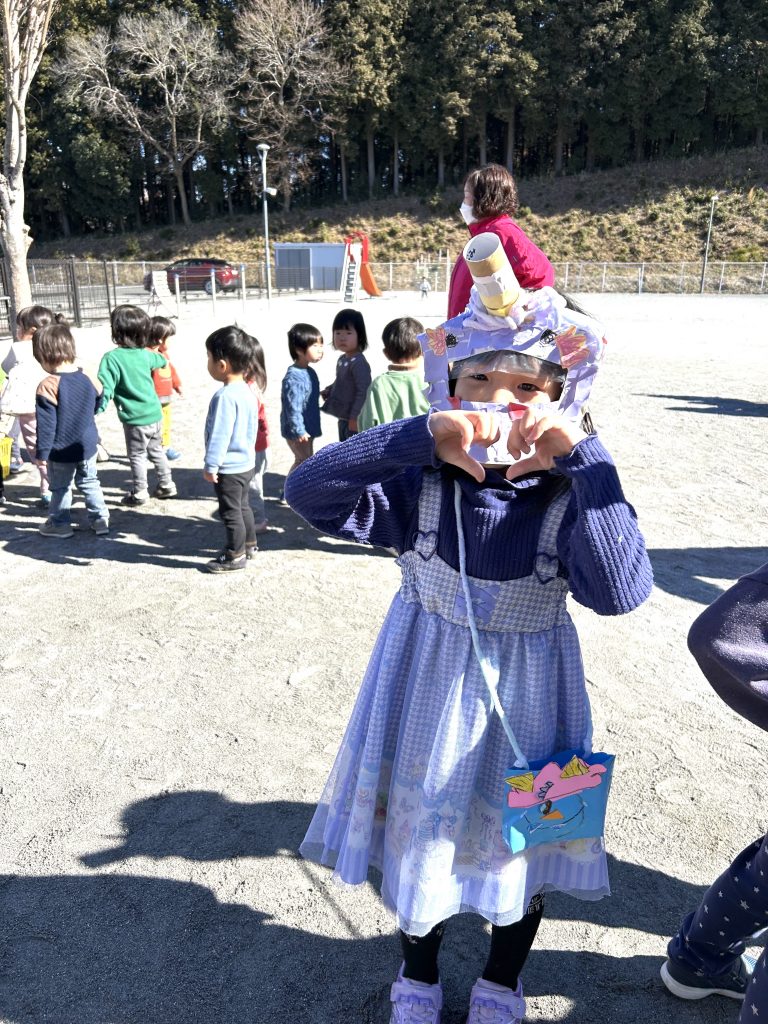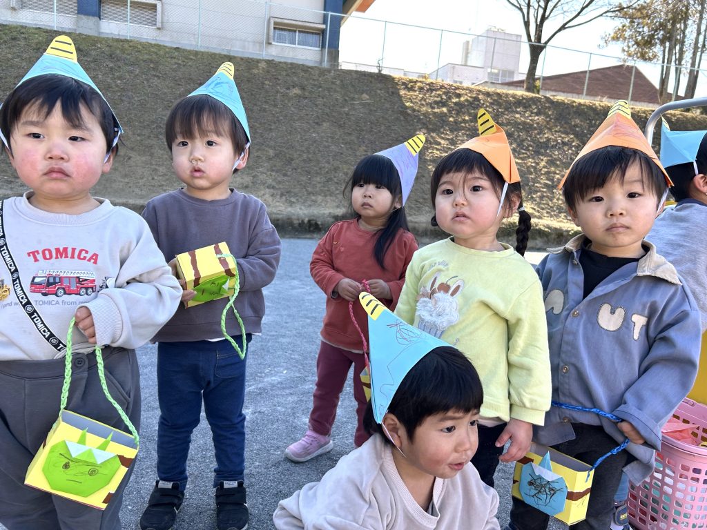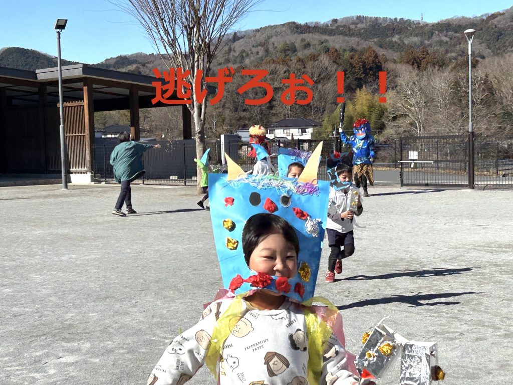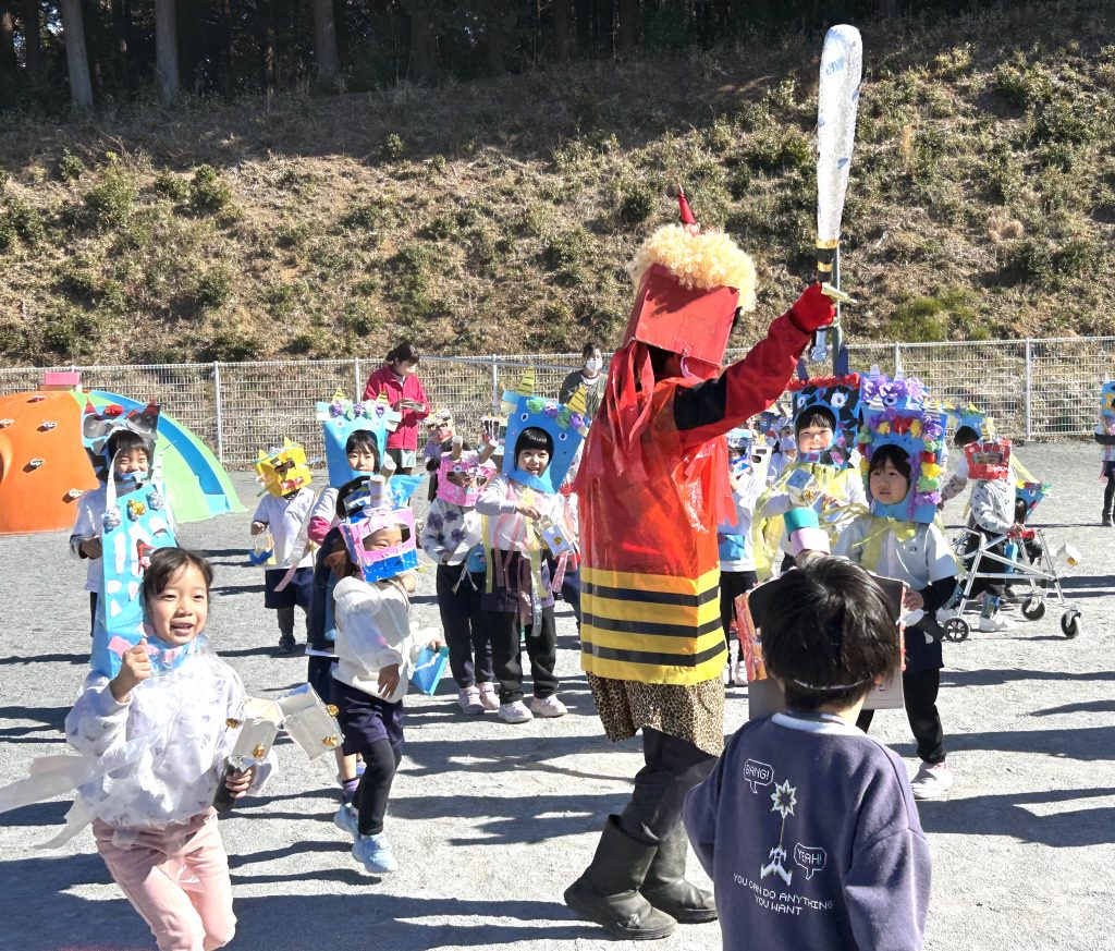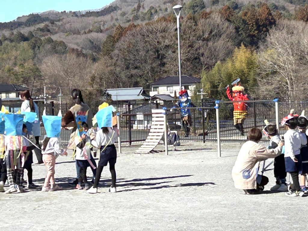 園庭に出てきたたくさんの小鬼たち。せつぶん集会はじまりはじまり〜📗