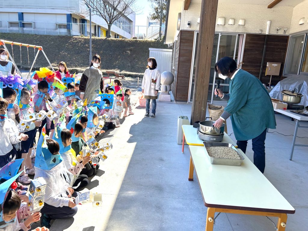 さてさて、こども園の準備は完了!自分の升に福豆を入れて、いざ鬼退治です👹