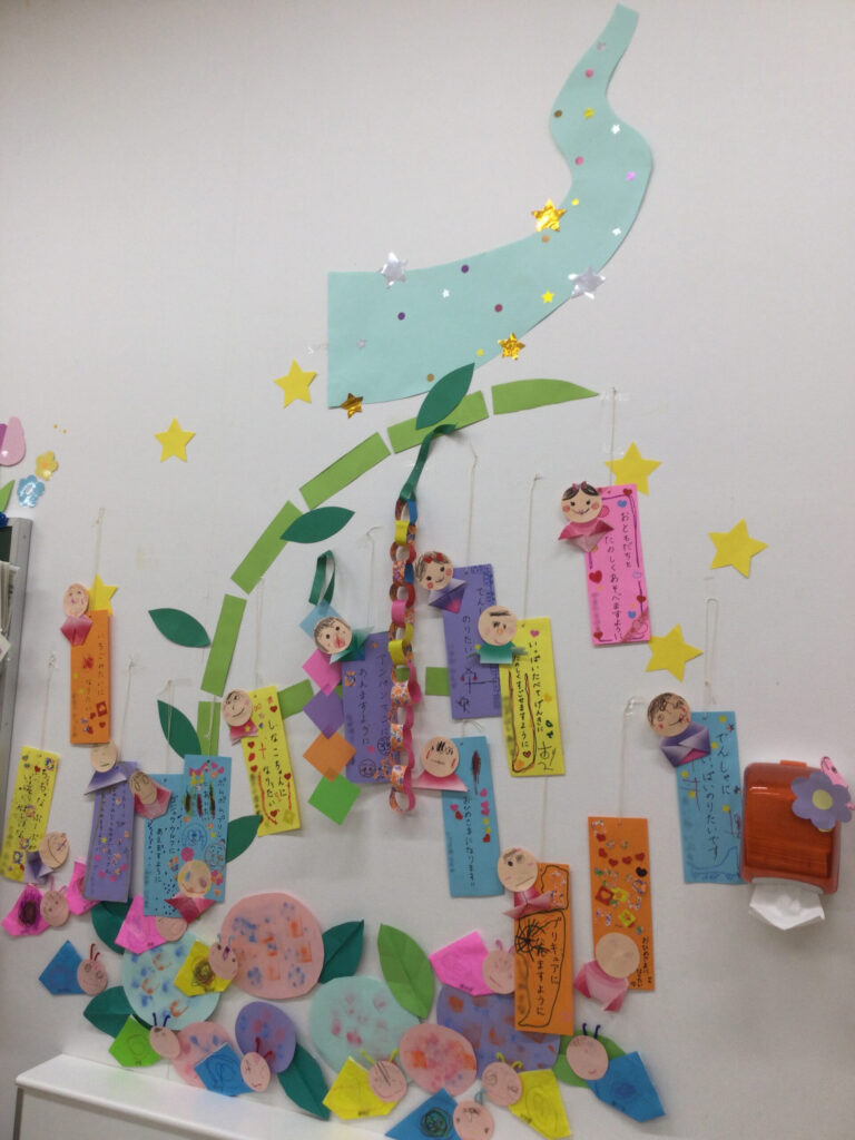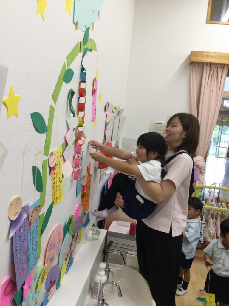おうちの人に抱っこをしてもらって笹飾りをします!とってもうれしそうですね😄