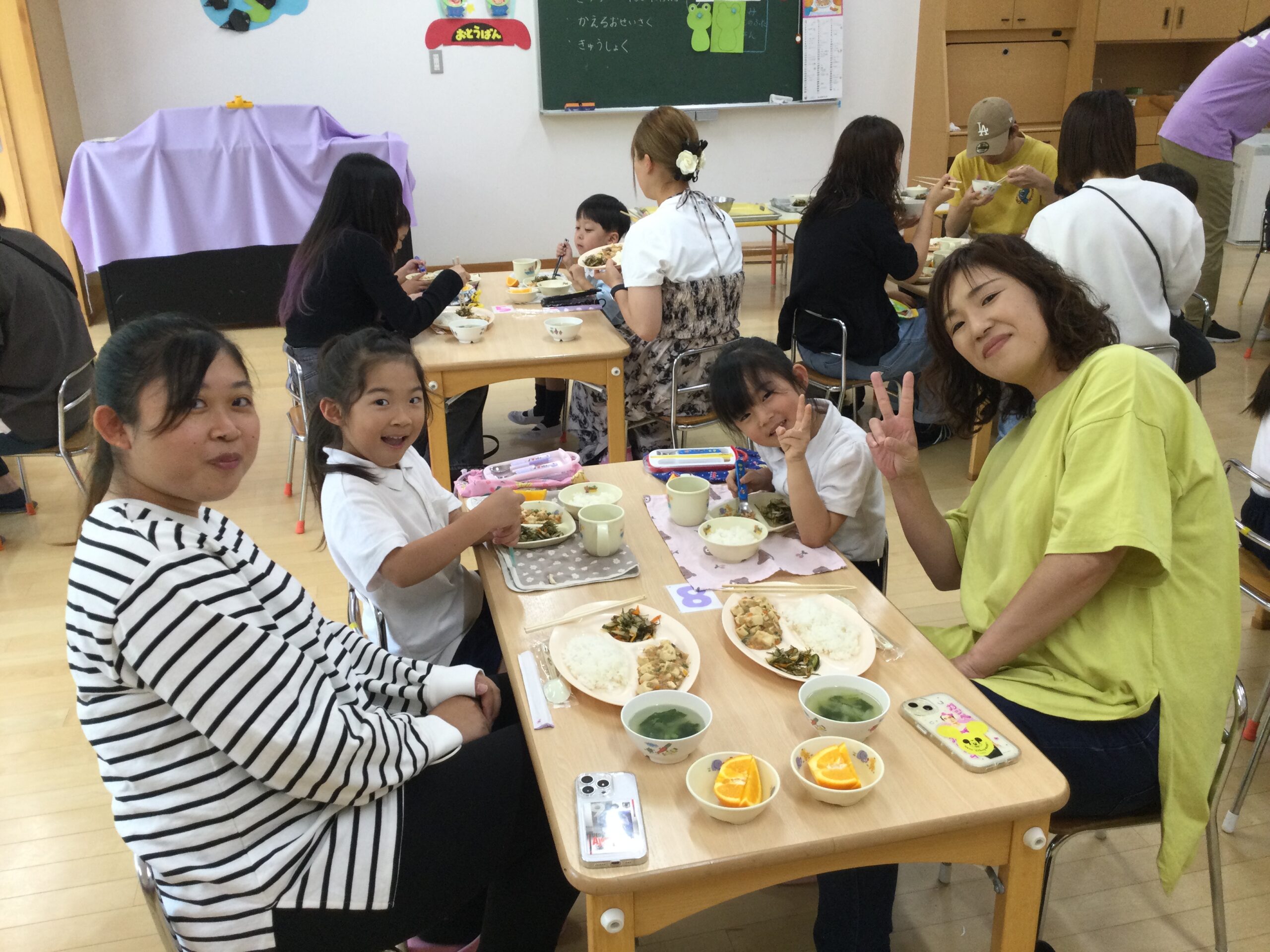 その後、4.5歳児は親子でおいしい給食を食べました🍽️こども園の献立をおうちの人にも喜んでいただけました(*^▽^*)