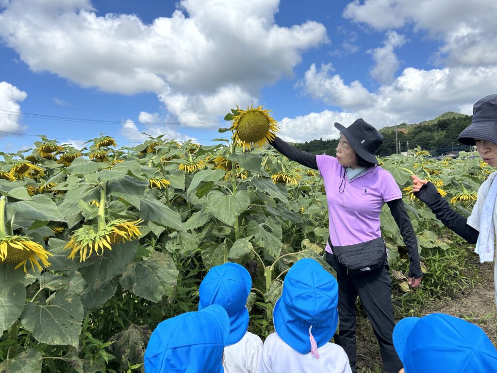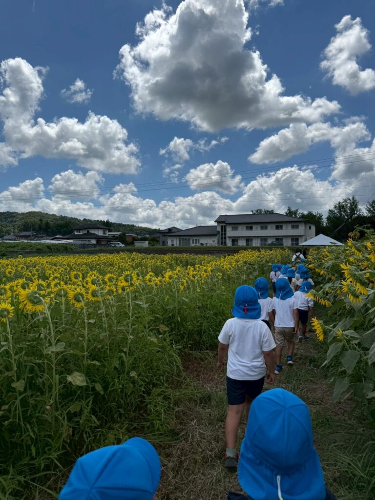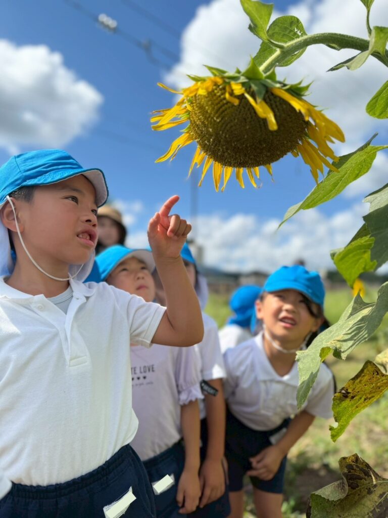 みんなはどこにいるでしょうか🔍(笑)子どもたちの背丈ほどあるひまわりが、たくさん咲いていますね!