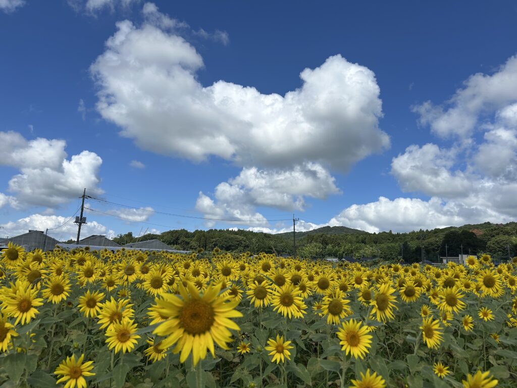 青い空に白い雲!!こちらを向いたヒマワリが誇らしげに咲いています🌻