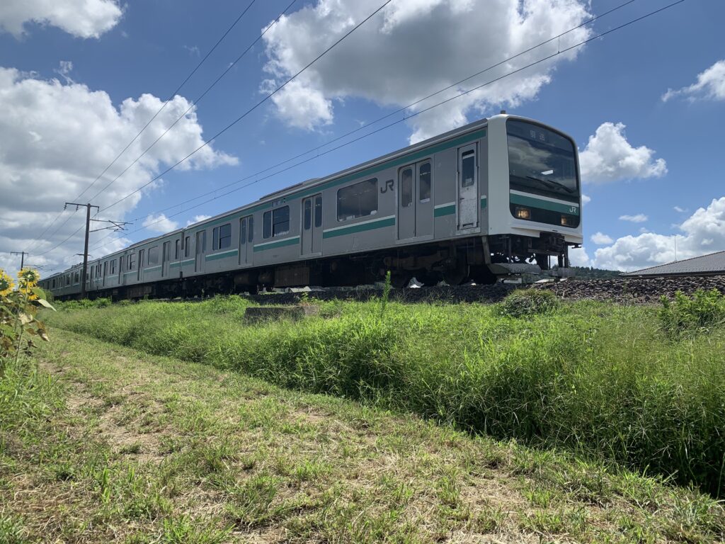 いなだこども園のすぐそばにも水戸線の線路がありますが、普段は青色の車両のはず・・・。