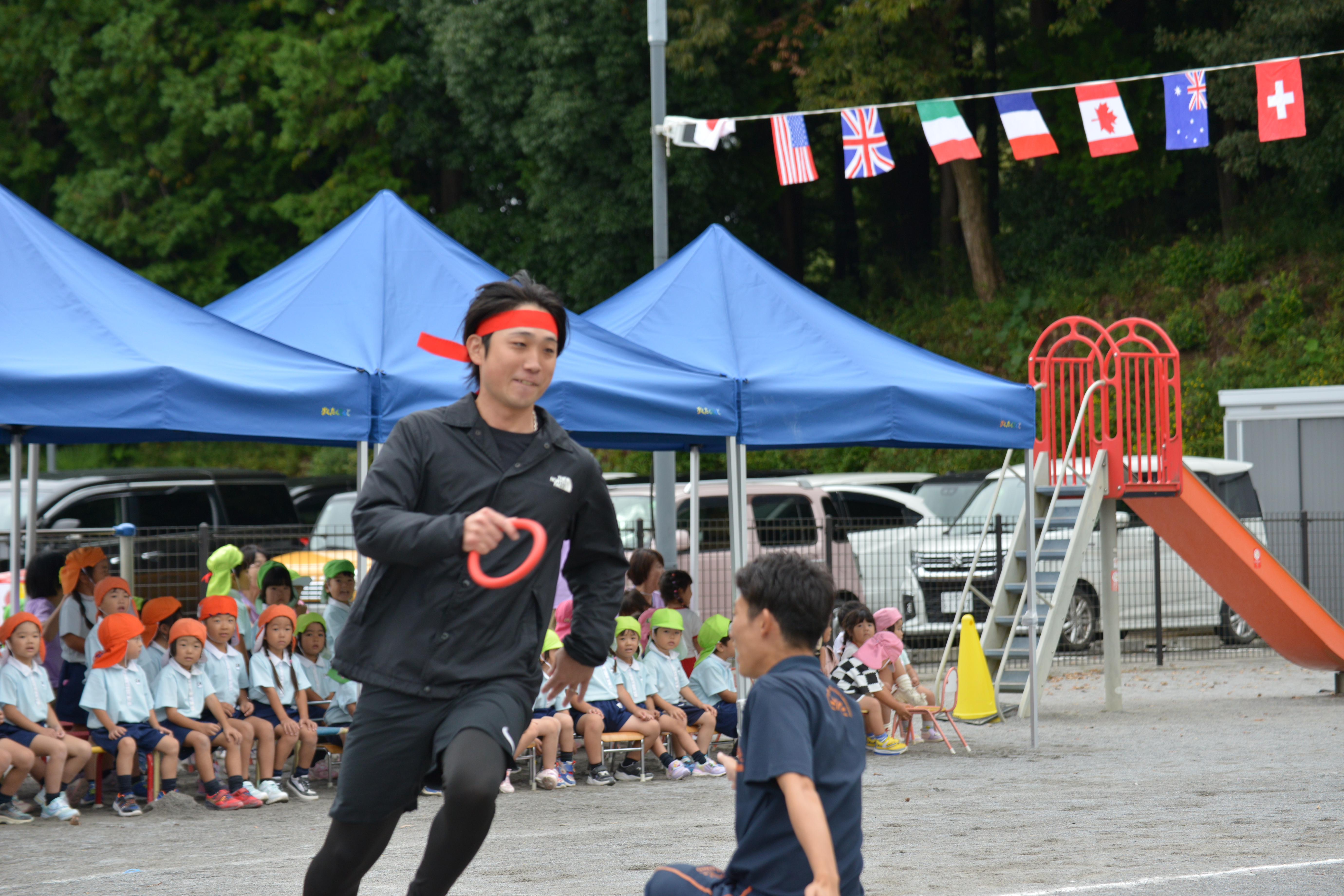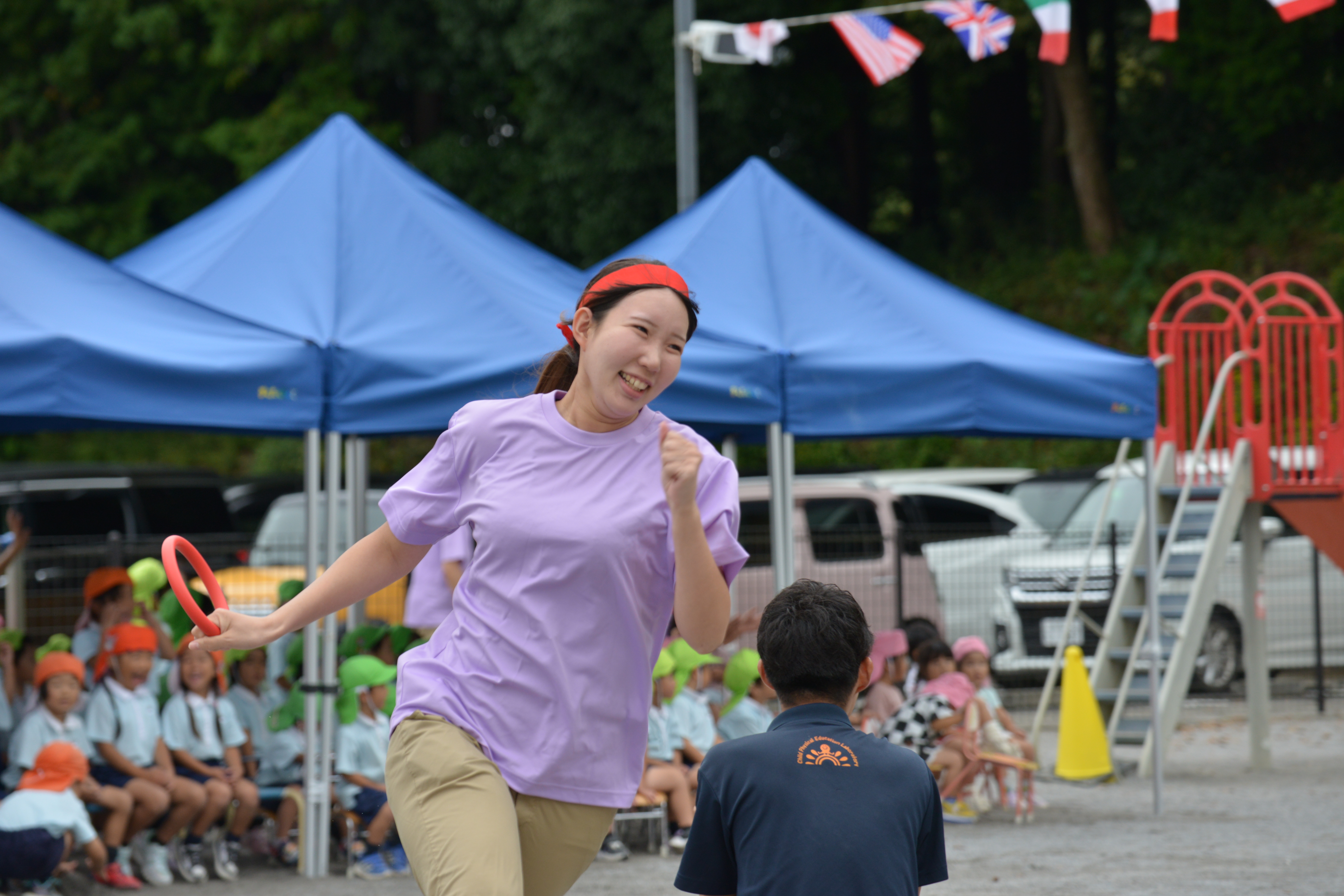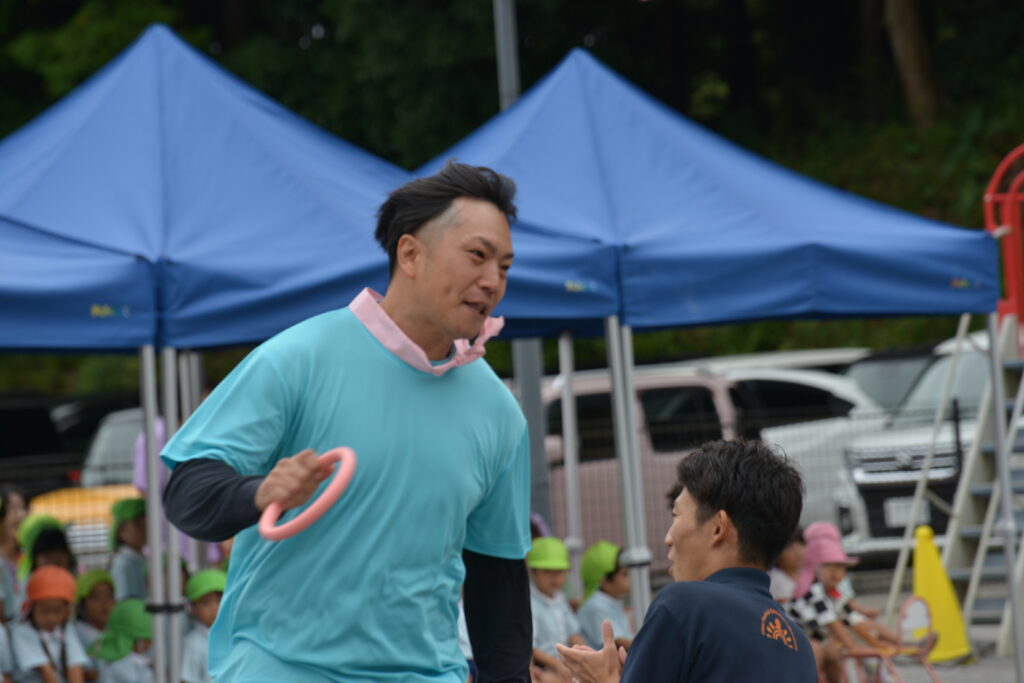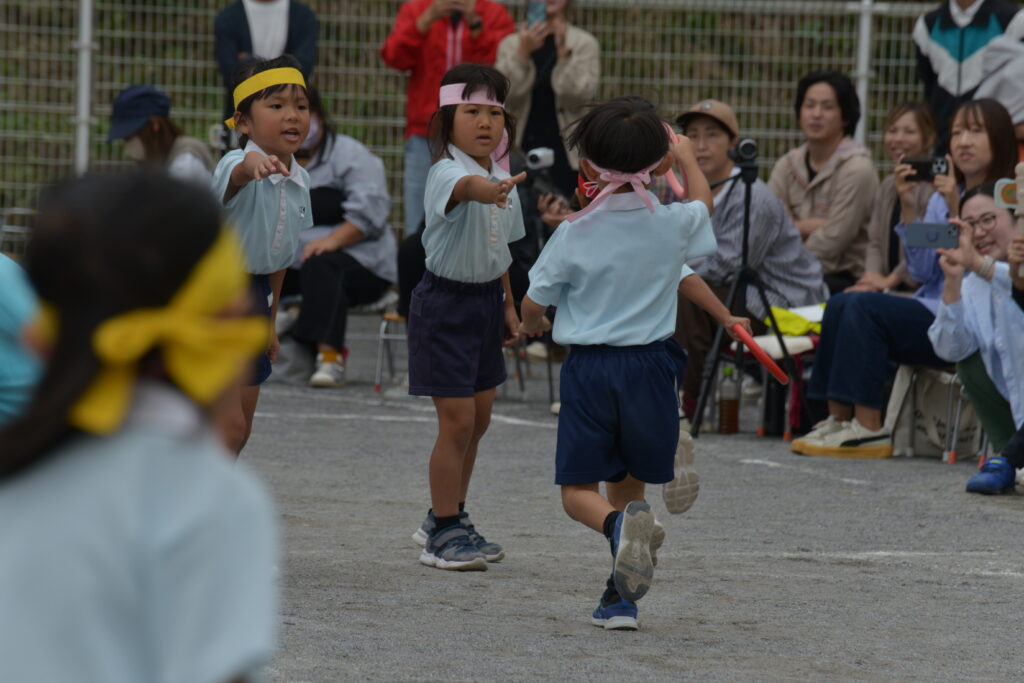 いなだこども園名物 “親子リレー” 子どもたちもおうちの人も全速力で走ります。子どもたちがつないだバトンを先生へ、先生がつないだバトンをおうちのひちへと渡していきます!