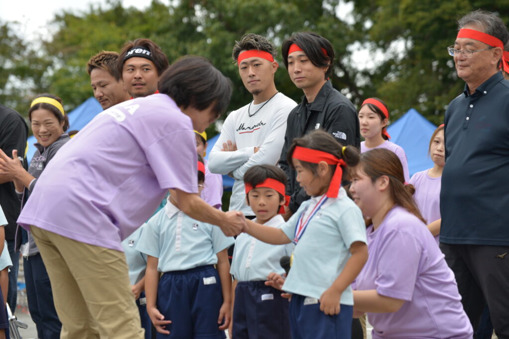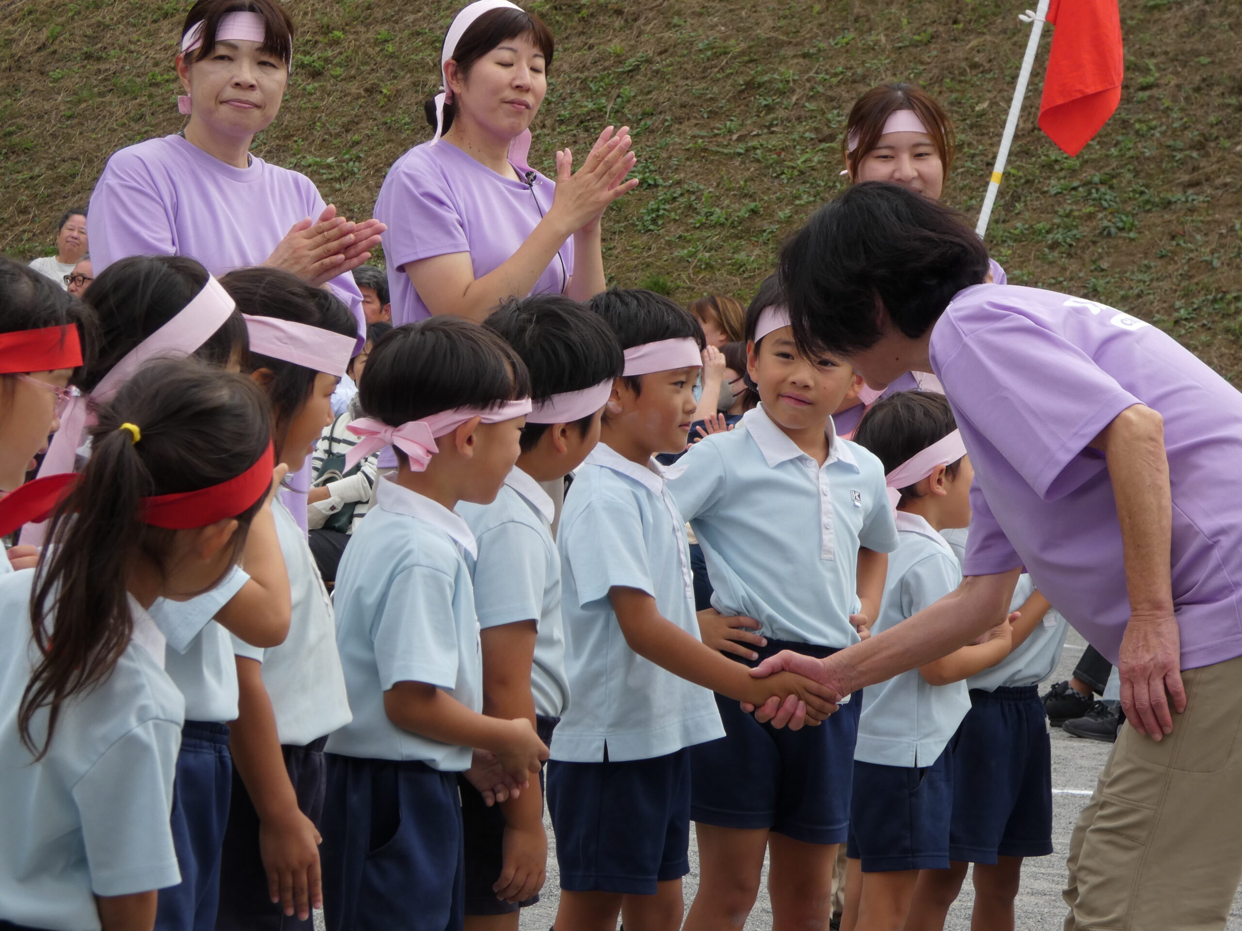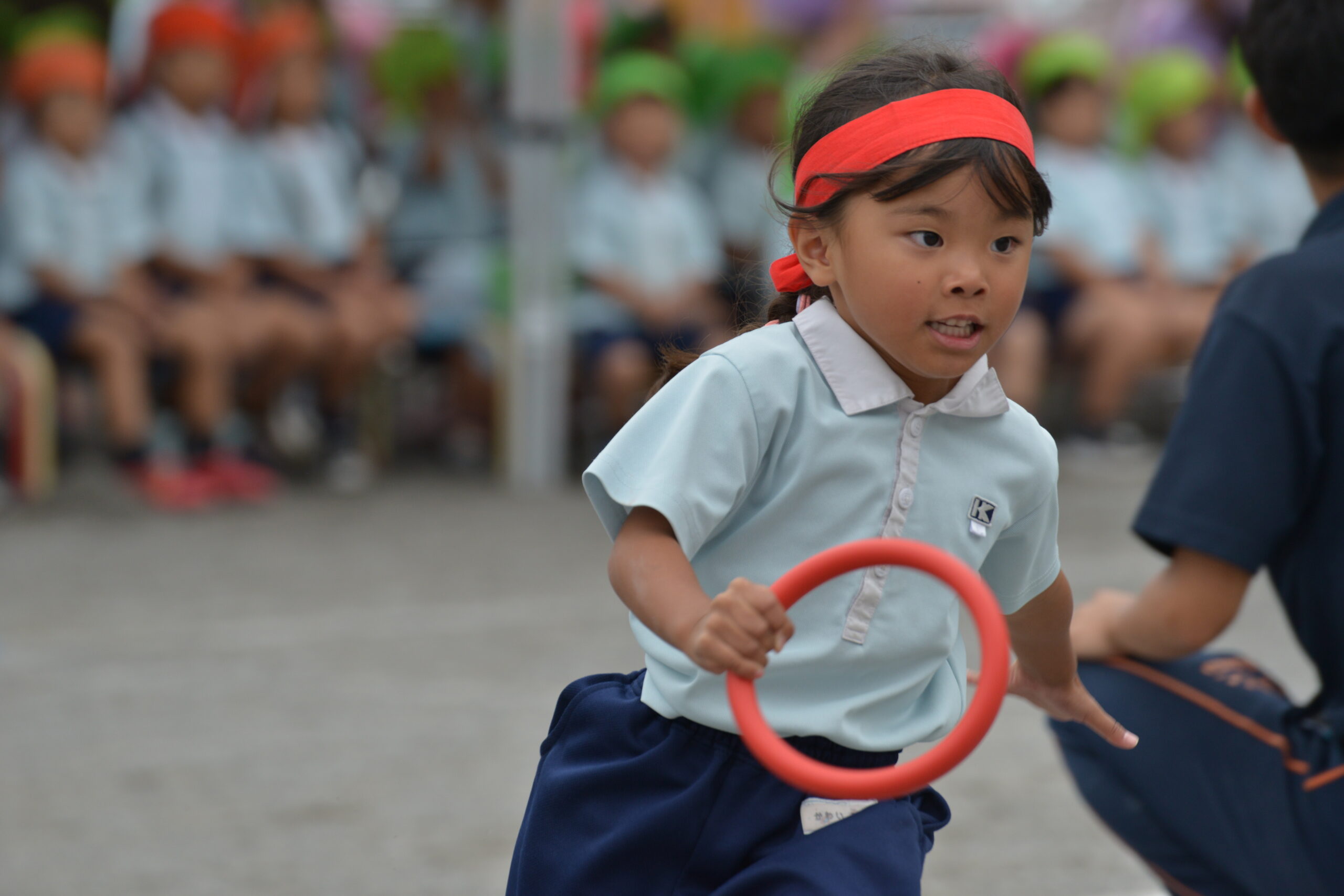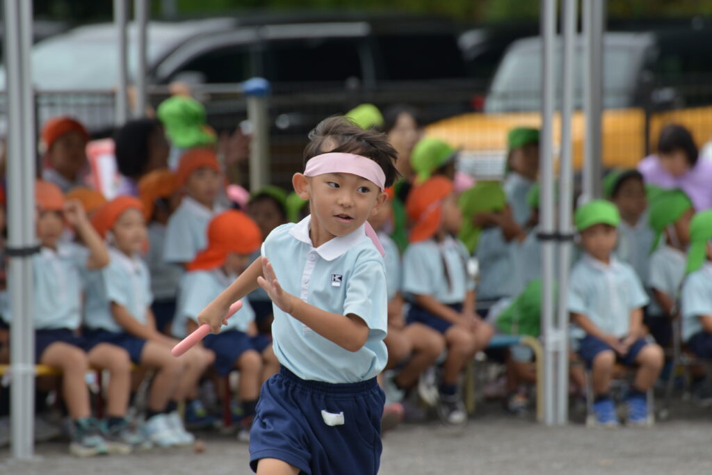 いなだこども園名物 “親子リレー” 子どもたちもおうちの人も全速力で走ります。子どもたちがつないだバトンを先生へ、先生がつないだバトンをおうちのひちへと渡していきます!