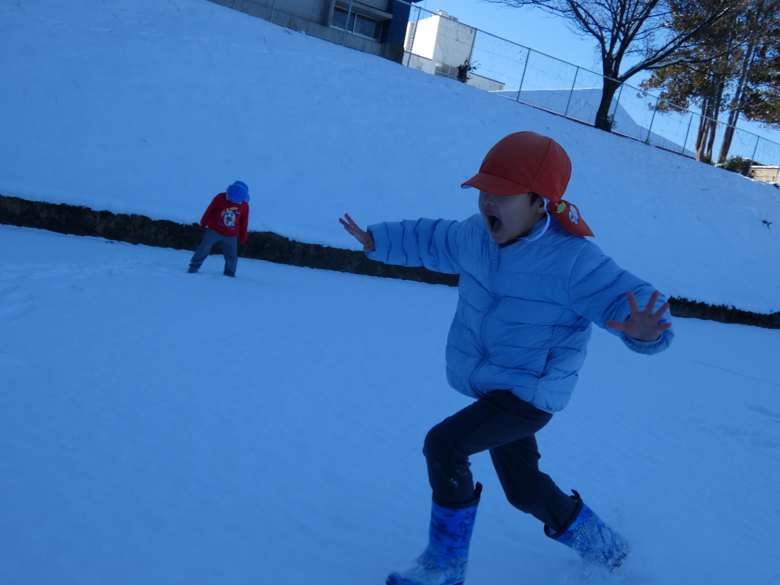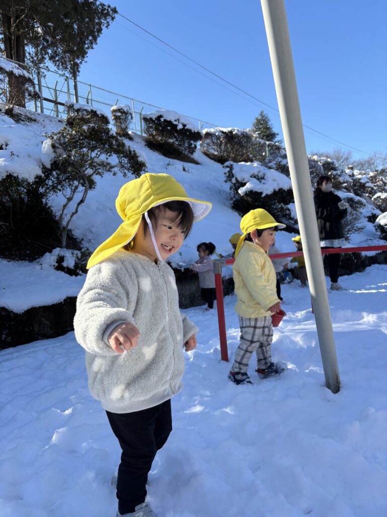 もちろん園庭にかけ出す子どもたち。ズボッズボッっと雪に足が取られても大はしゃぎ‼️