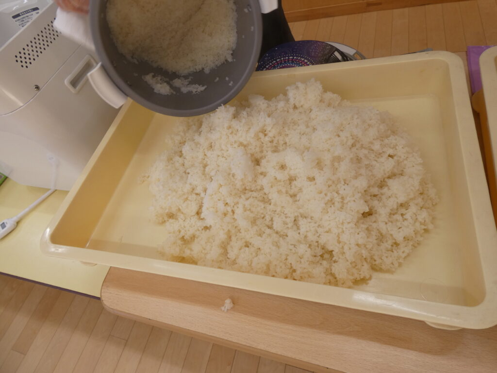 こうじ菌は生き物。熱くても冷たくても死んでしまいます。蒸したての熱々のお米を冷ますと、みんなと同じくらいの温かさになりました。