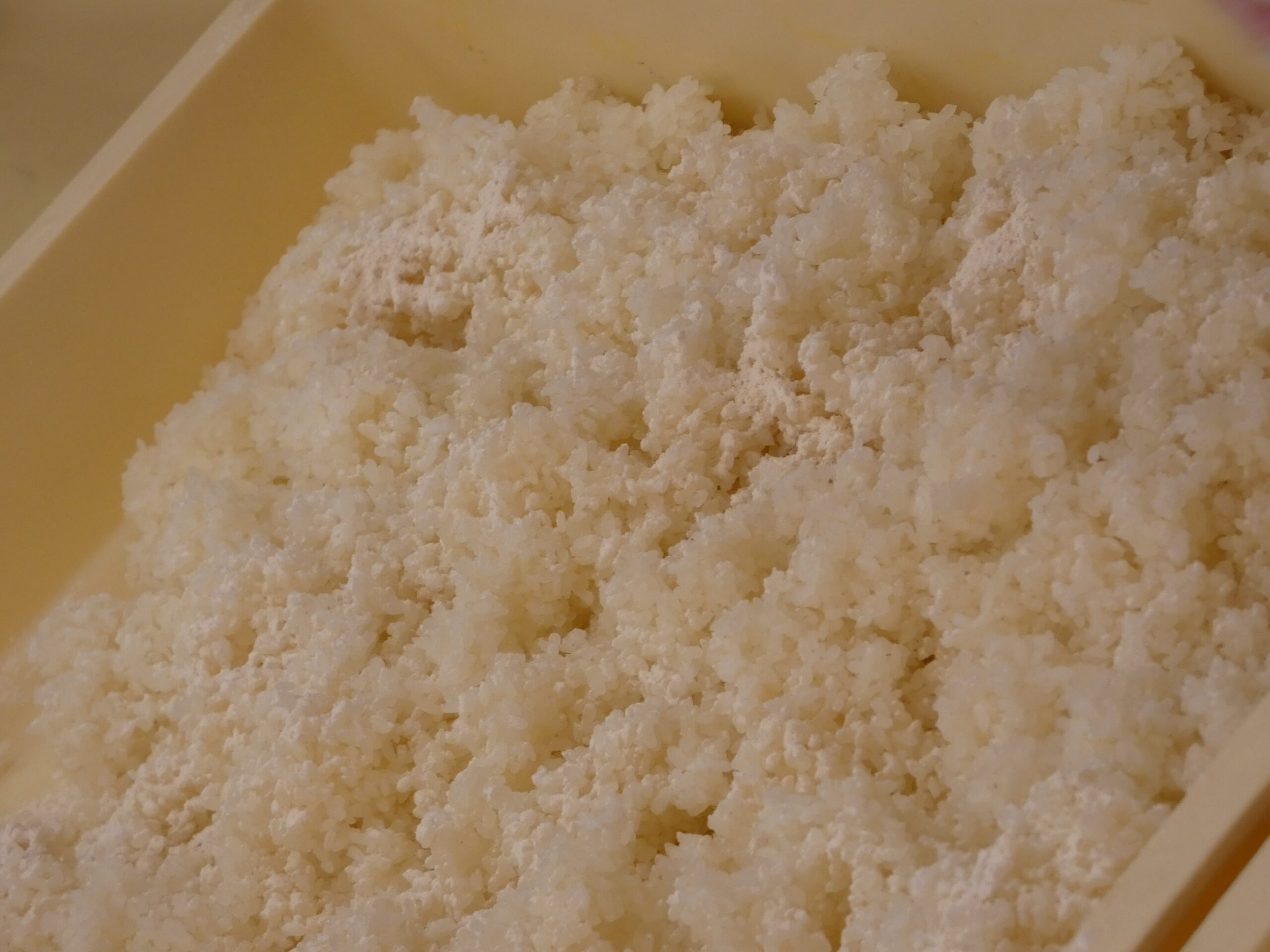 蒸したお米にこうじ菌を入れて米こうじを作ります。