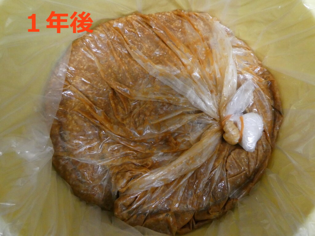 しばらくの間涼しい所で過ごすと、ほらこんなに熟成しています。こちらは昨年仕込んだみそです。