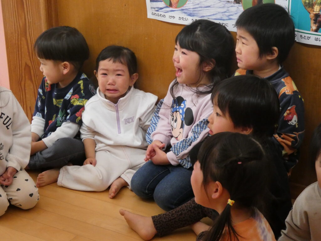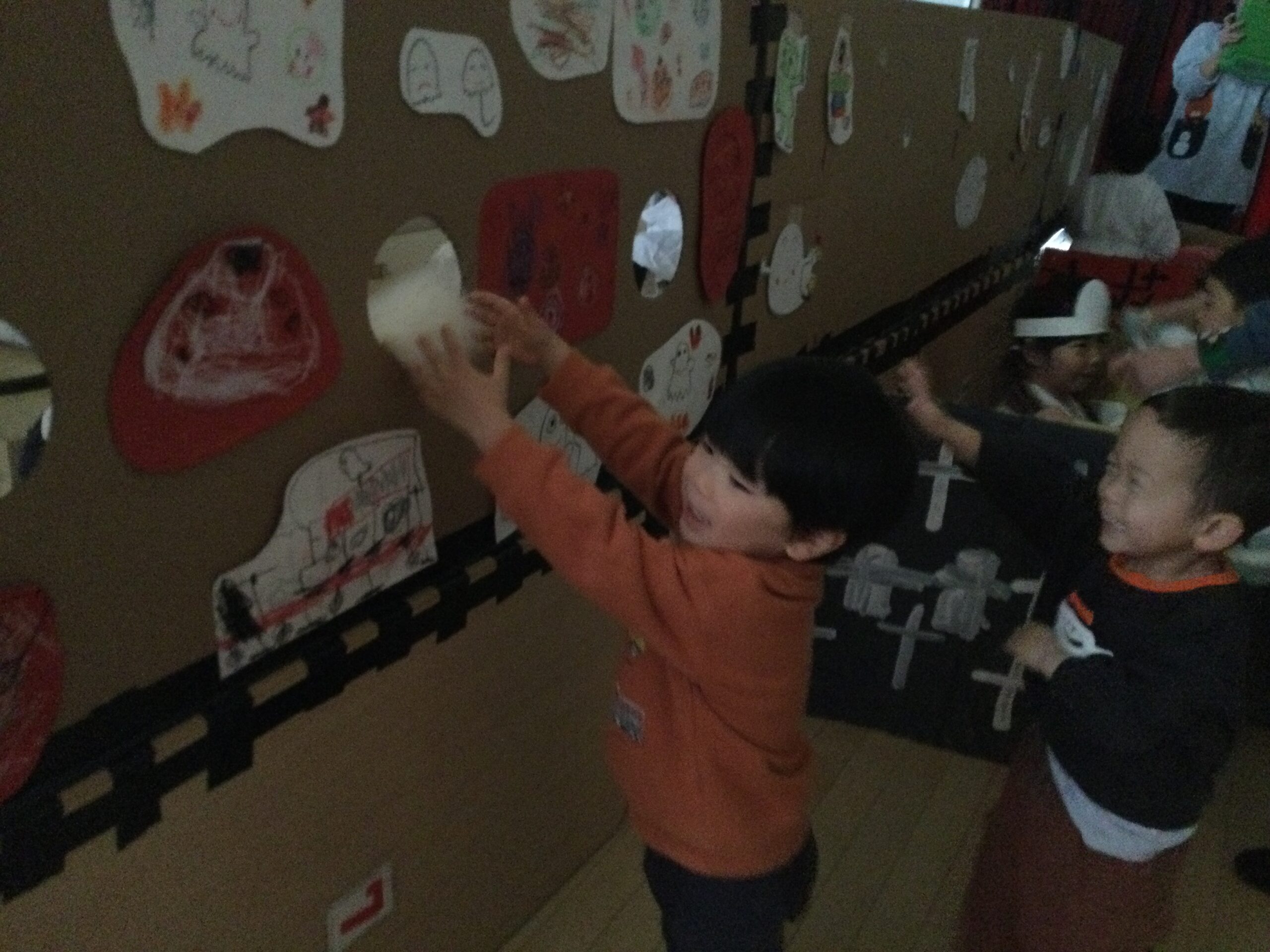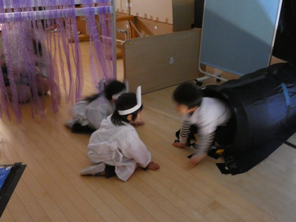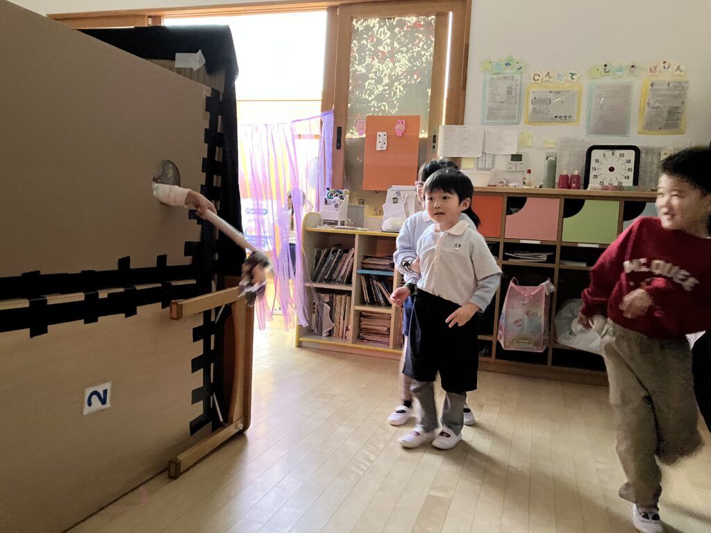 びっくりしたのもつかの間、お化けさんは容赦なく出てきます。小さなクラスのお友達も遊びに来てくれました。お化けを捕まえて大爆笑するりす組さん🤣と、怖くて大号泣するうさぎ組さん😂